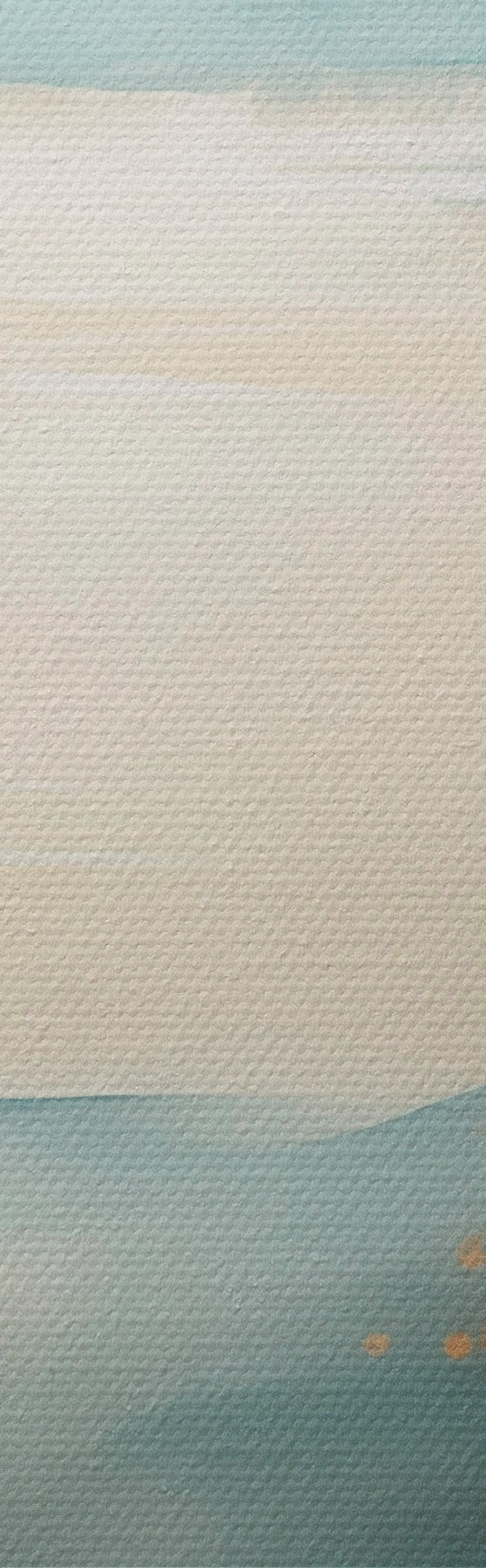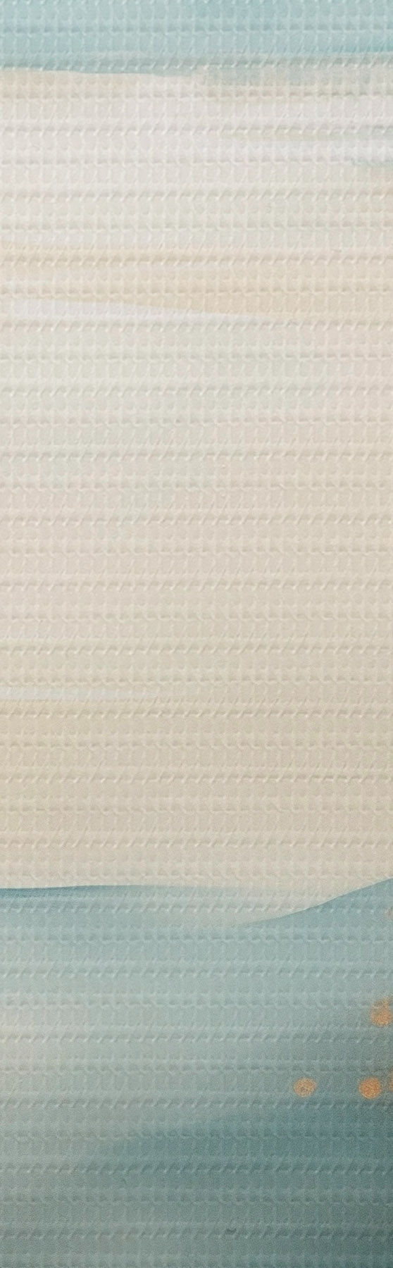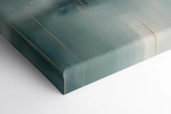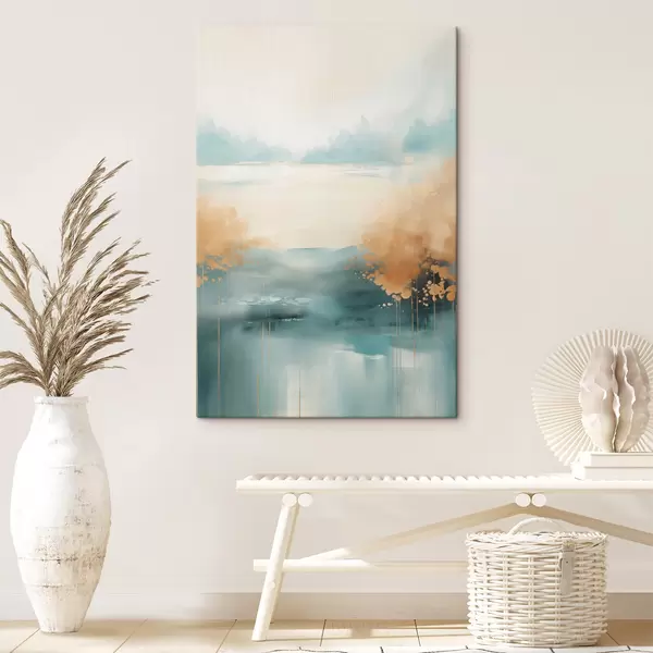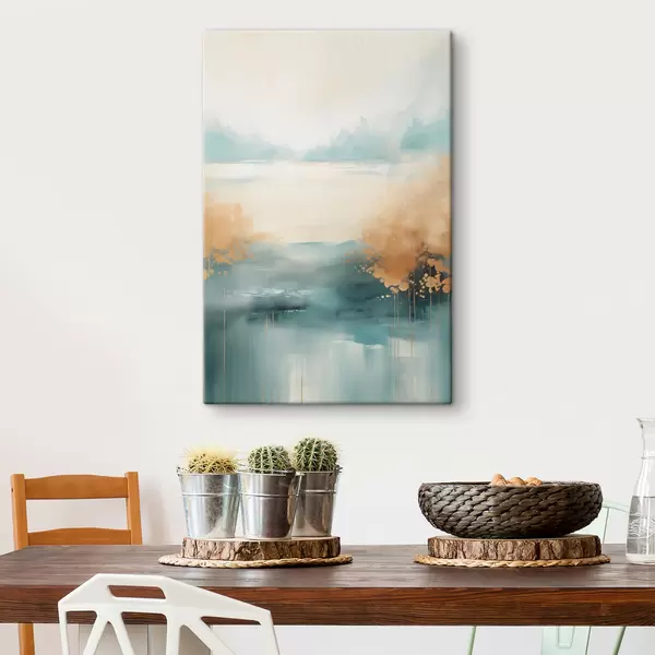 Glezna Abstrakts ainavas ar kalniem un ezeru zilgani zaļā un teksturētā dzeltenā krāsā, maigi otas triepieni, minimālisma mākslas darbs Nr s46704