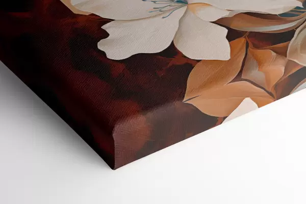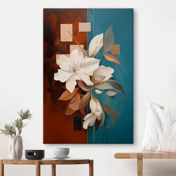 Glezna Abstraktas baltas puķes un lapas uz brūna un zila fona ar abstraktām formām, minimālisma stilā s46709