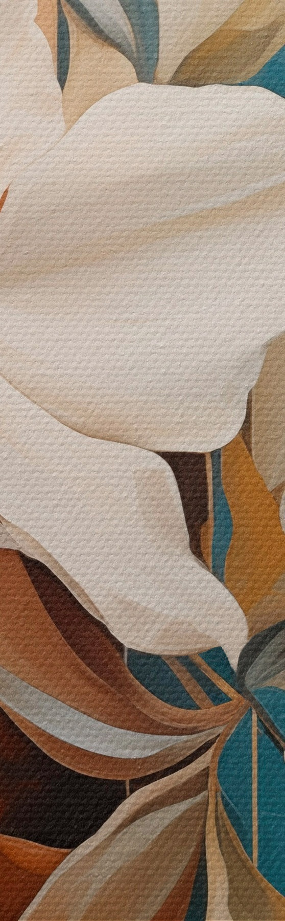 Glezna Abstraktas baltas puķes un lapas uz brūna un zila fona ar abstraktām formām, minimālisma stilā Nr s46709
