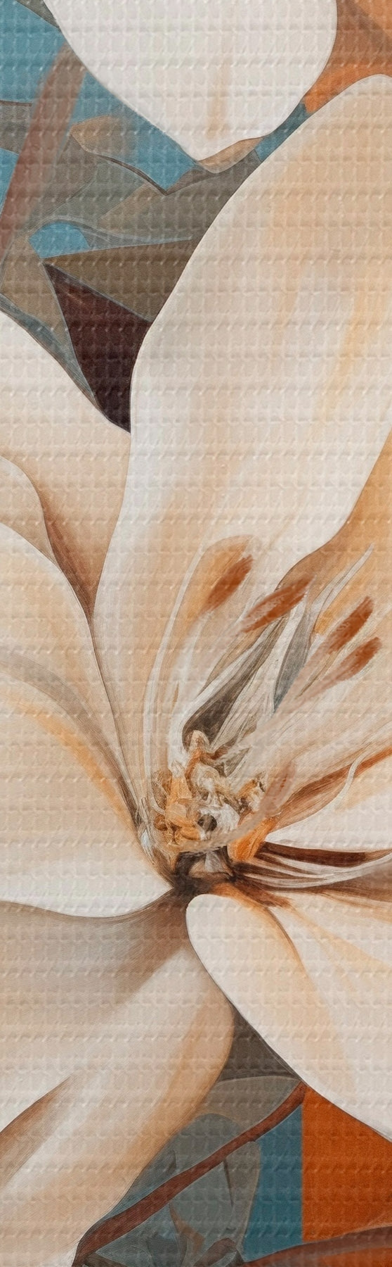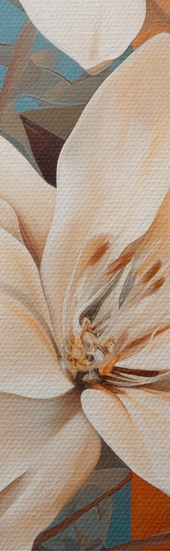 Glezna Abstraktas baltas puķes un lapas uz brūna un zila fona ar abstraktām formām, minimālisma stilā Nr s46710