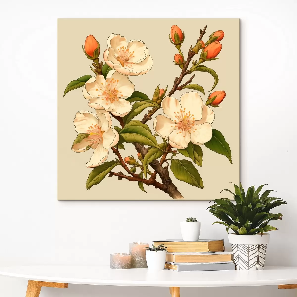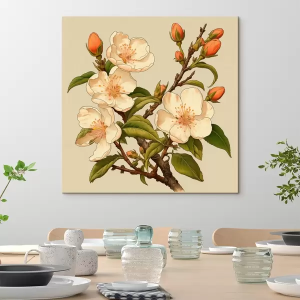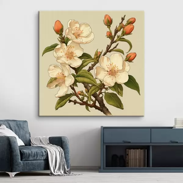 Glezna Ziedoša zaru ar baltiem ziediem uz smilškrāsas fona klasiskā ilustrācijas stilā s46923