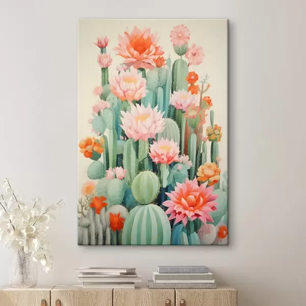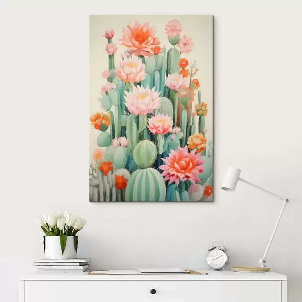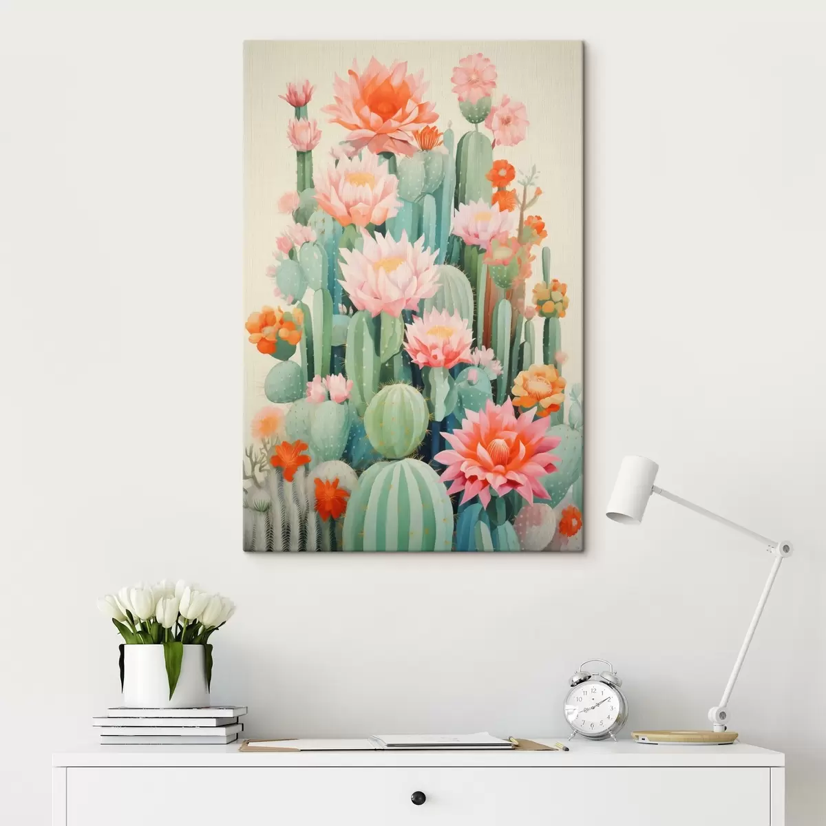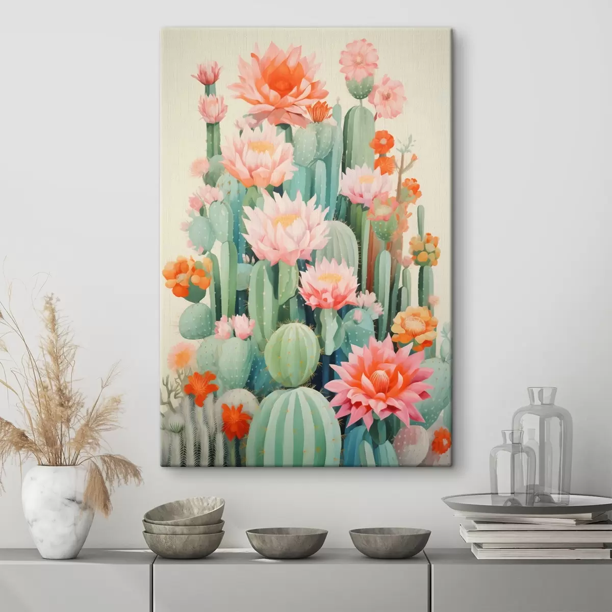 Glezna Ziedošie kaktusi ar rozā un oranžiem ziediem ilustrācijas stilā s46934