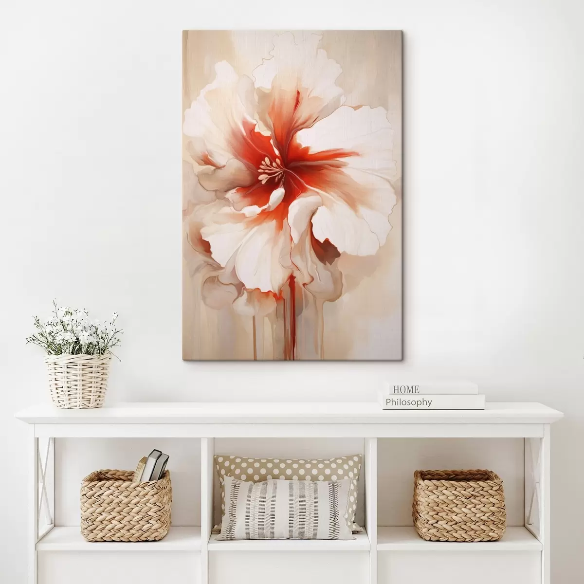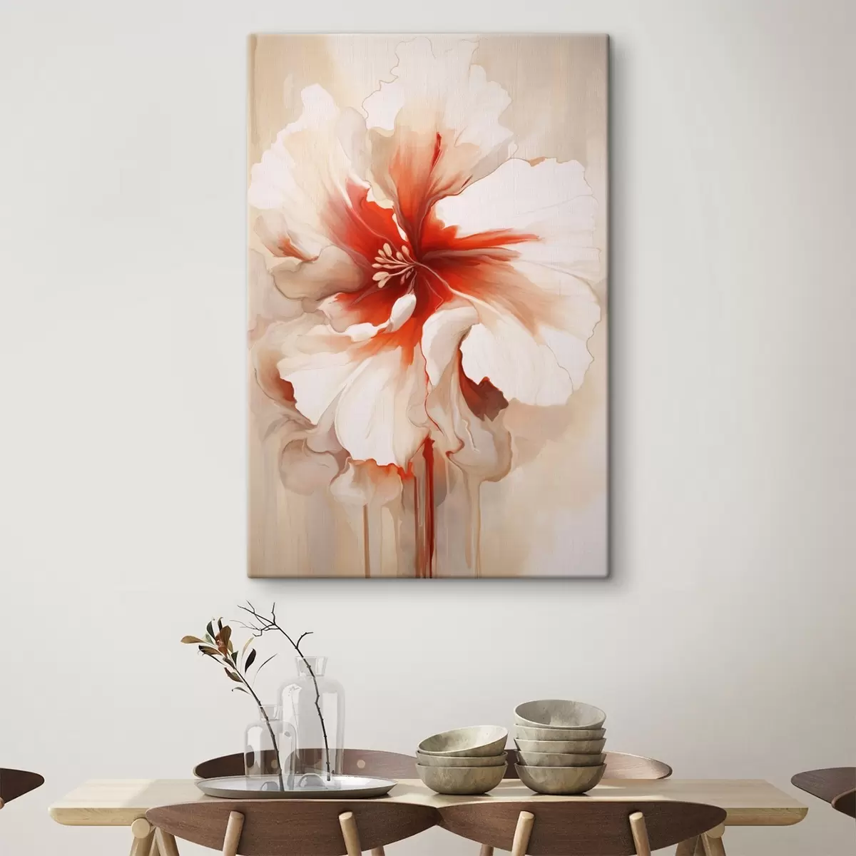 Glezna Tuva uzņēmuma balta un sarkana zieda ar puscaurspīdīgiem ziedlapiem un plūstošiem krāsas pilieniem Nr s46941
