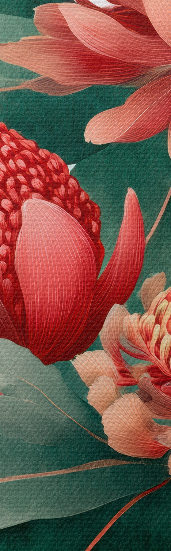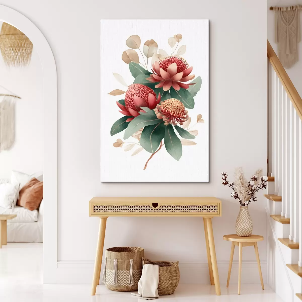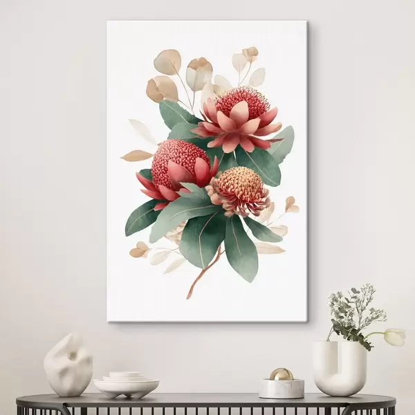 Glezna Ziedu kompozīcija ar lielām protejām un eikaliptiem modernā digitālās glezniecības ilustrācijas stilā s46955