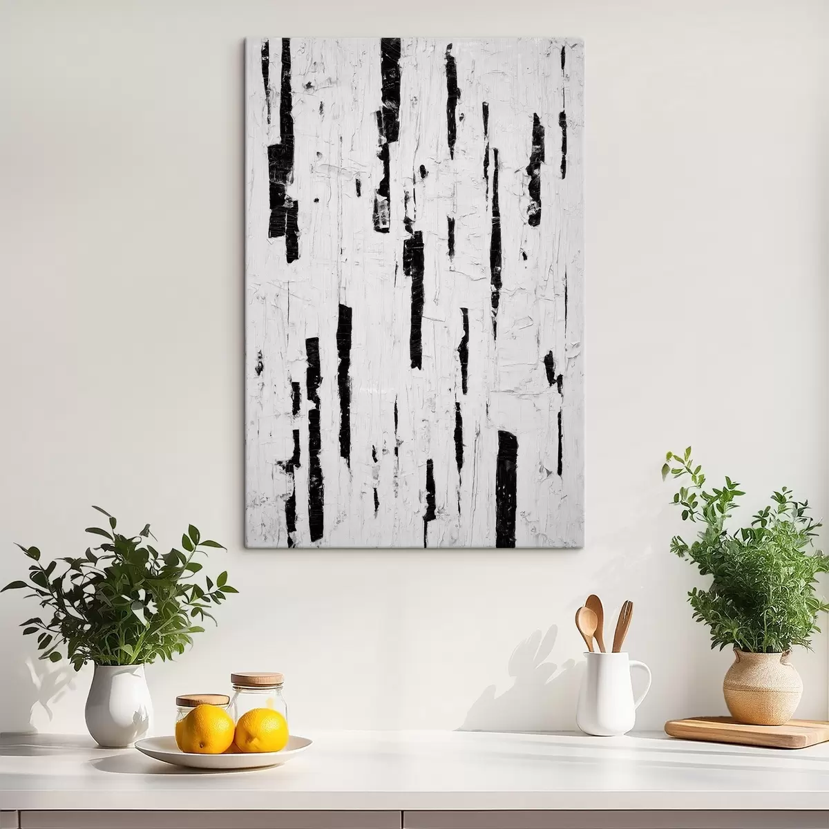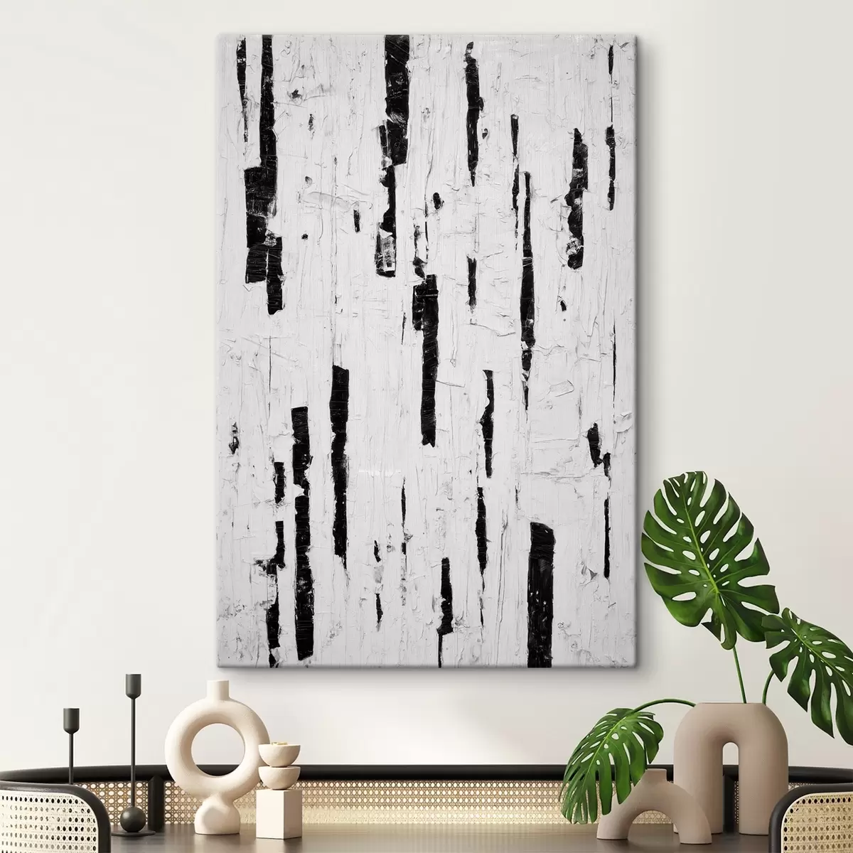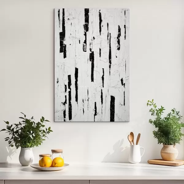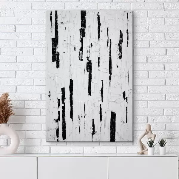Glezna Abstrakta kompozīcija ar melniem vertikāliem triepieniem uz balta fona eļļas gleznas stilā s46956