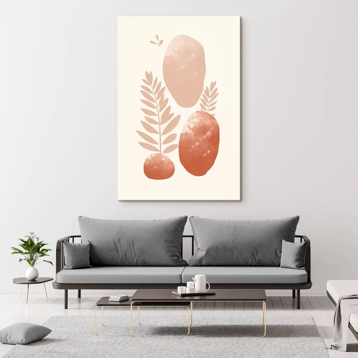 Glezna Abstraktas formas, teksturēti akmeņi un lapas klusinātos persiku un terakotas toņos, minimālisma stilā, krēmkrāsas fonā. s47012