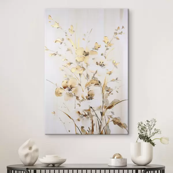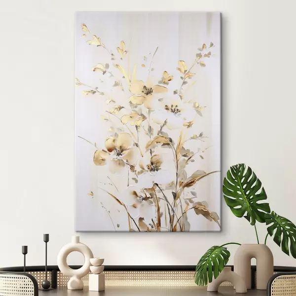 Glezna Teksturēti dzelteni ziedi un lapas uz balta fona, ar delikātiem otu triepieniem s47017