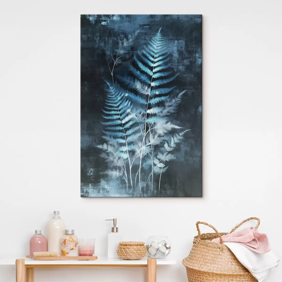 Glezna Zilas papardes un augi uz tumša, faktūru fona, ar uzsvaru uz sarežģītajām detaļām, rentgena efekts Nr s47026