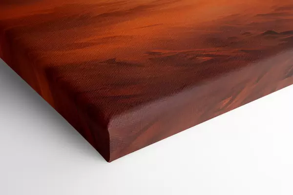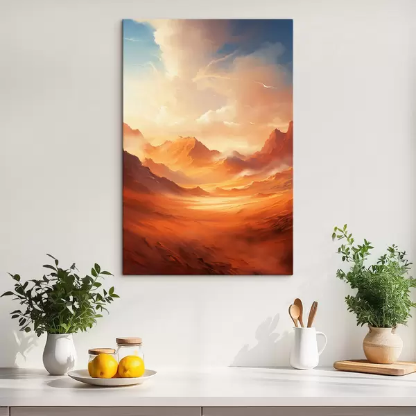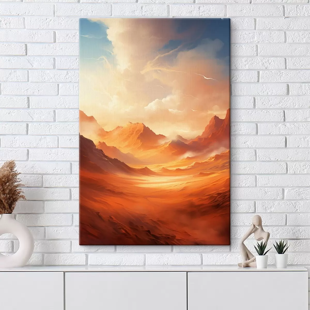 Glezna Plaša, oranža tuksneša ainava ar stāvajām, klinšainajām kalnām zem miglas apklāta, saulainā debesīm ar plāniem mākoņiem. Nr s47028