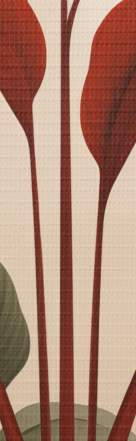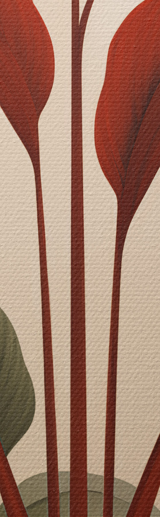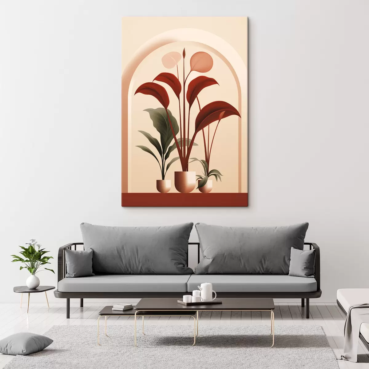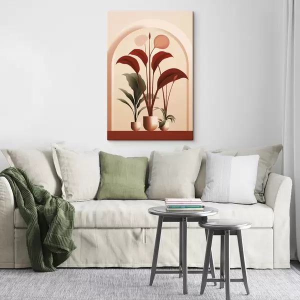 Glezna Abstrakti podos augi ar lielām zaļām un sarkanām lapām krēmkrāsas arkas priekšā s47033
