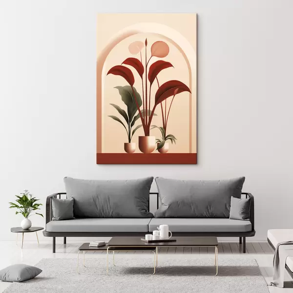 Glezna Abstrakti podos augi ar lielām zaļām un sarkanām lapām krēmkrāsas arkas priekšā Nr s47033