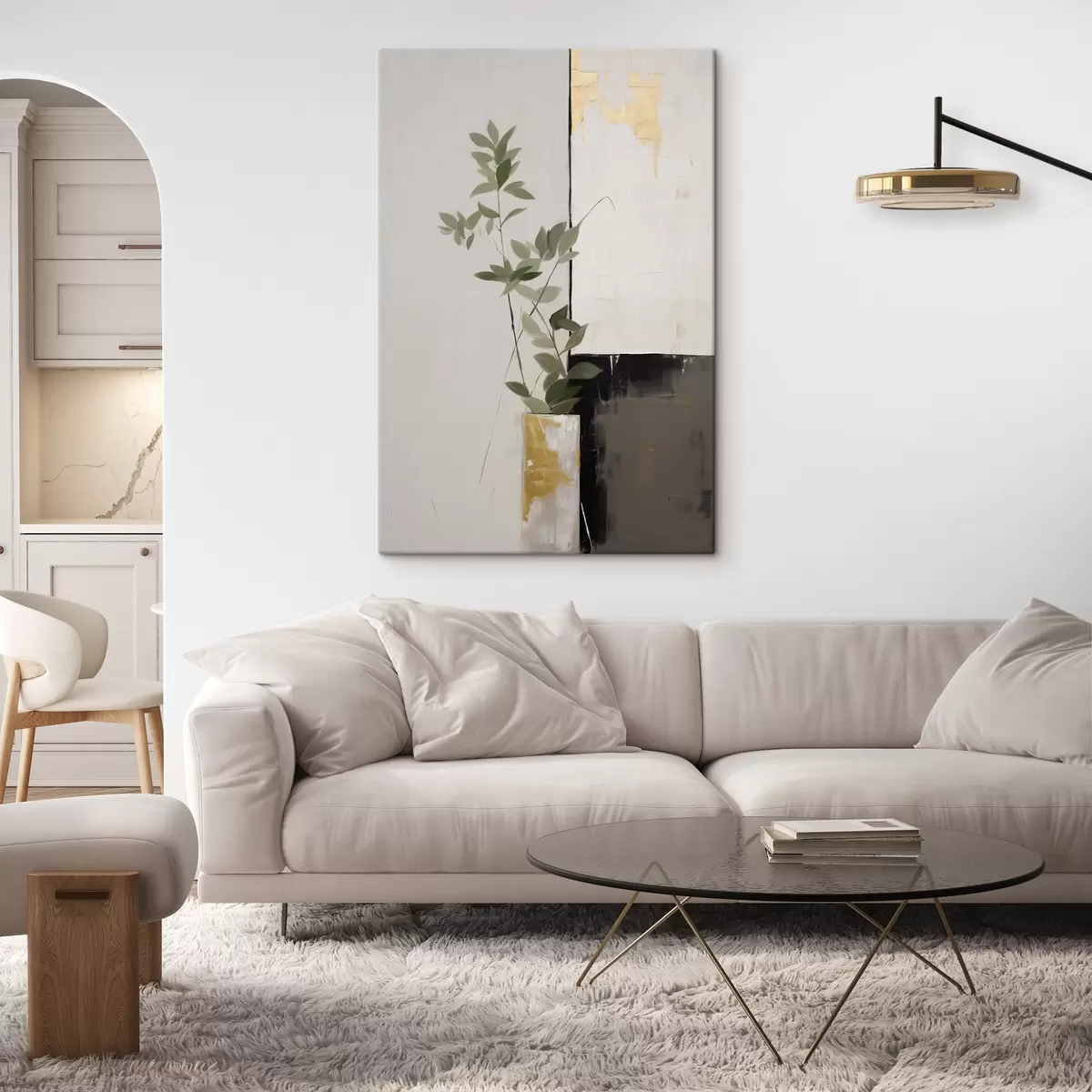 Glezna Minimālisma stilā veidota glezna, kurā attēlota vāze ar zaļām lapām uz abstraktu ģeometrisku figūru fona. Nr s47036