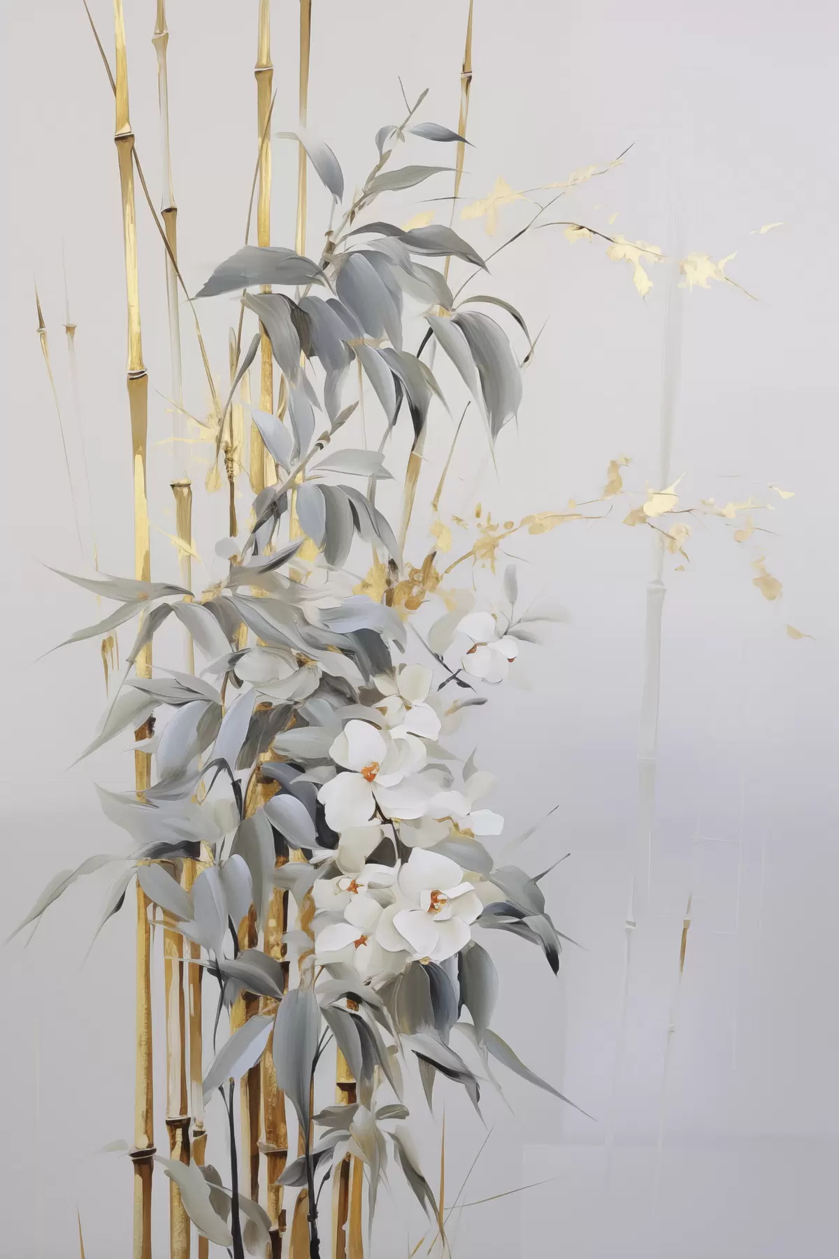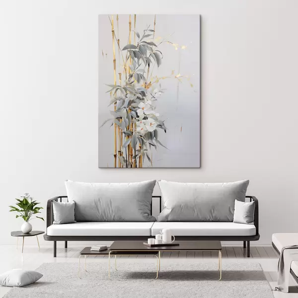 Glezna Abstrakti bambusa stublāji ar dzelteniem akcentiem, maigi balti ziedi un gaiši zaļas lapas, pelēks fons Nr s47038