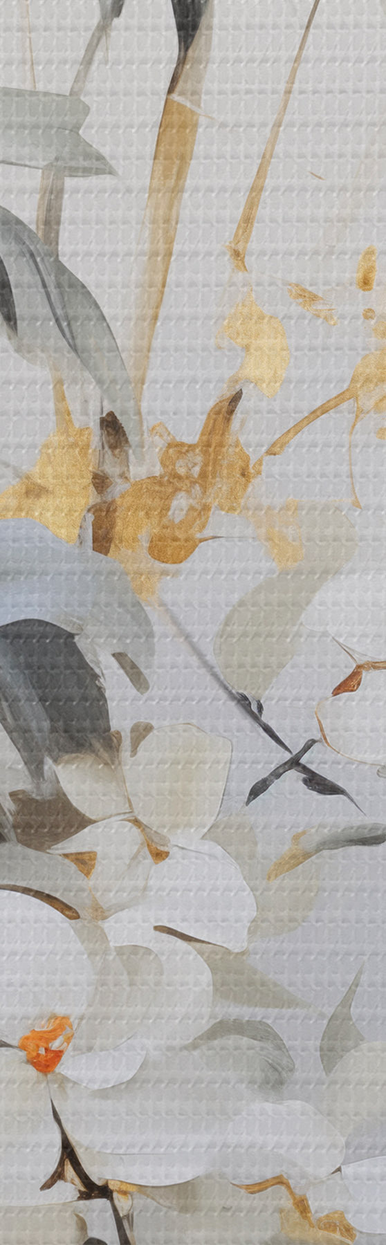 Glezna Abstrakti bambusa stublāji ar dzelteniem akcentiem, maigi balti ziedi un gaiši zaļas lapas, pelēks fons s47038