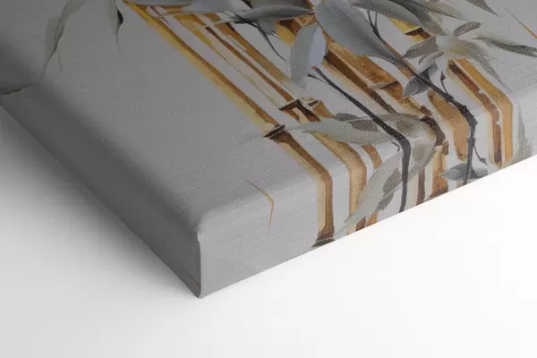 Glezna Abstrakti bambusa stublāji ar dzelteniem akcentiem, maigi balti ziedi un gaiši zaļas lapas, pelēks fons s47038
