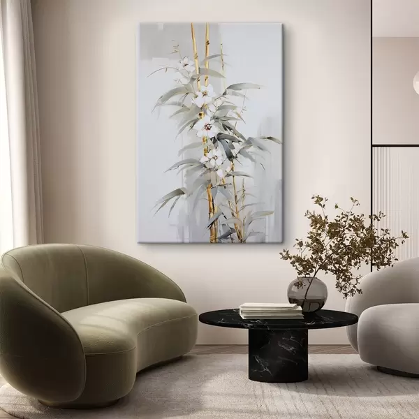 Glezna Abstrakti bambusa stublāji ar dzelteniem akcentiem, maigi balti ziedi un gaiši zaļas lapas, pelēks fons Nr s47039