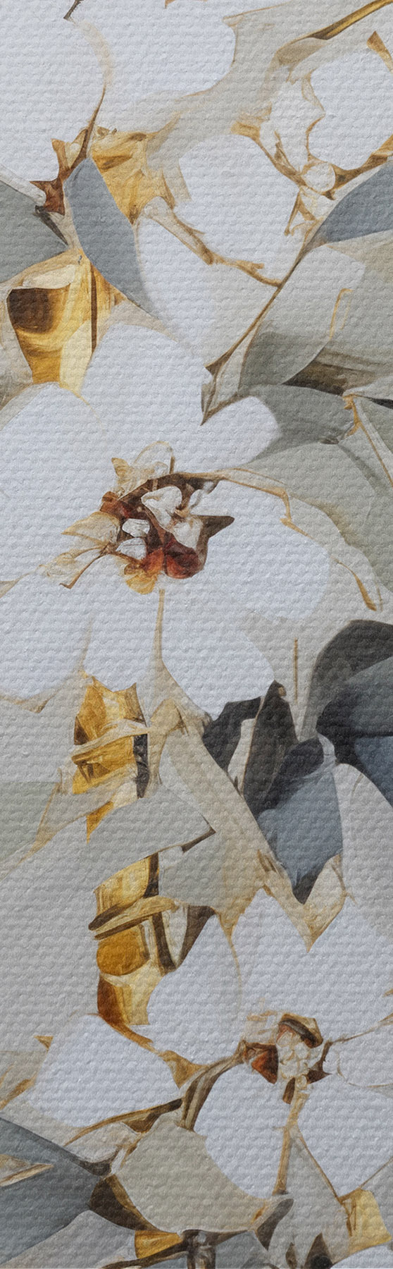 Glezna Abstrakti bambusa stublāji ar dzelteniem akcentiem, maigi balti ziedi un gaiši zaļas lapas, pelēks fons s47039
