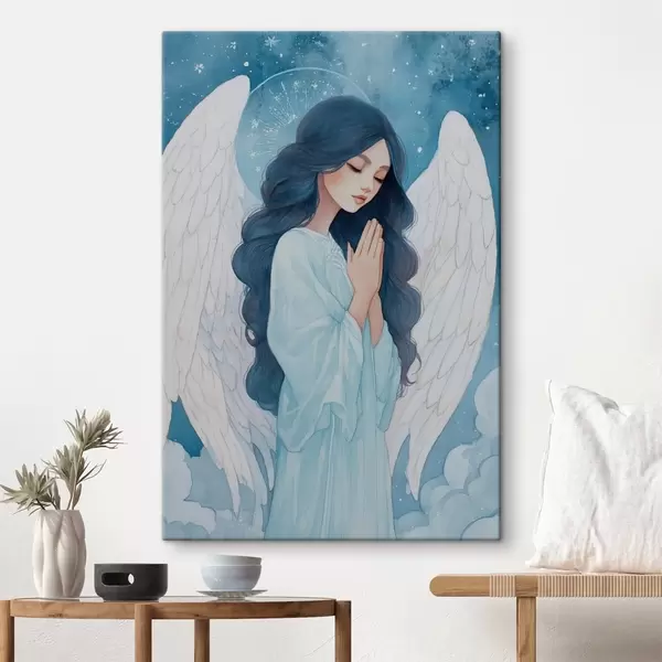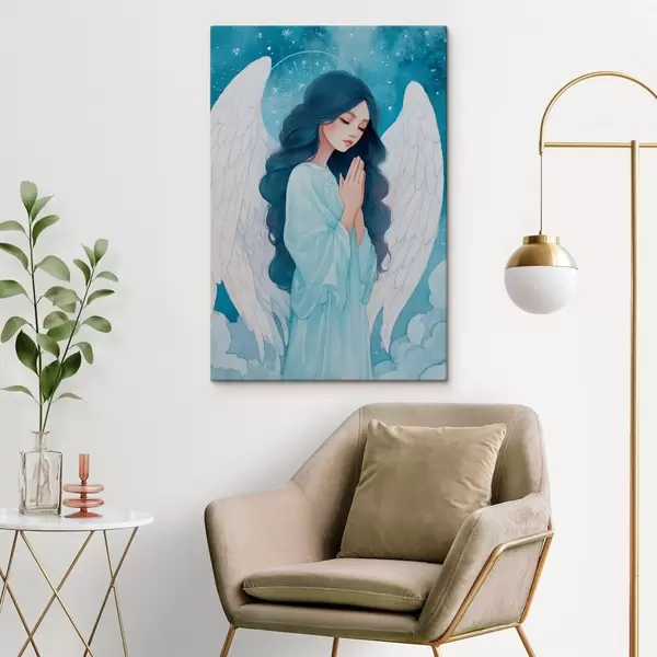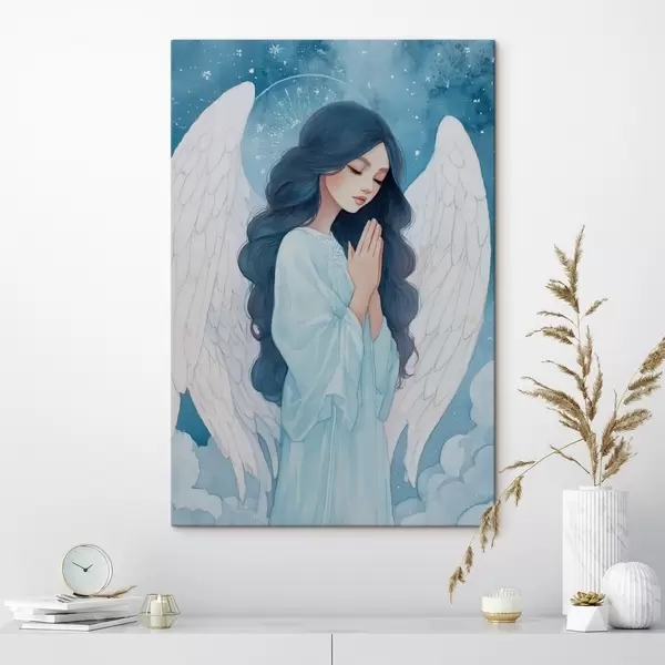 Glezna Burvīga ilustrācija ar eņģeli starp mākoņiem balta un zila krāsu toņos s47095