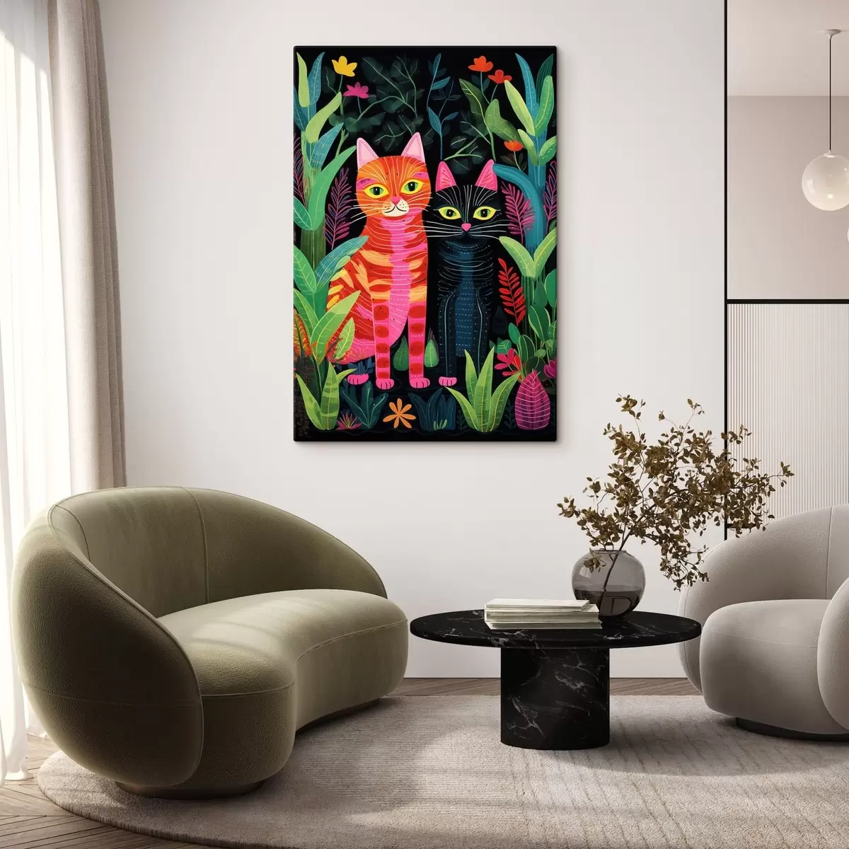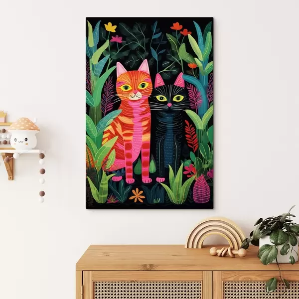 Glezna Divas stilizētas kaķi starp košām augiem Nr s47298