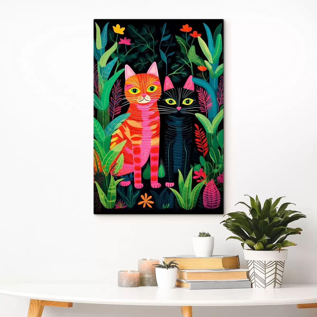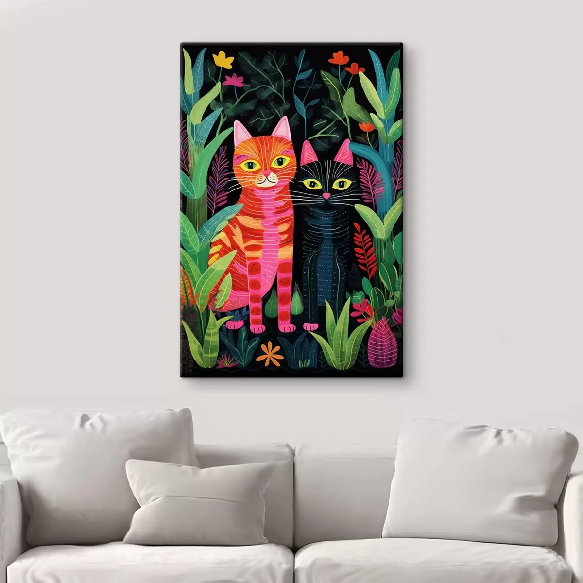 Glezna Divas stilizētas kaķi starp košām augiem s47298