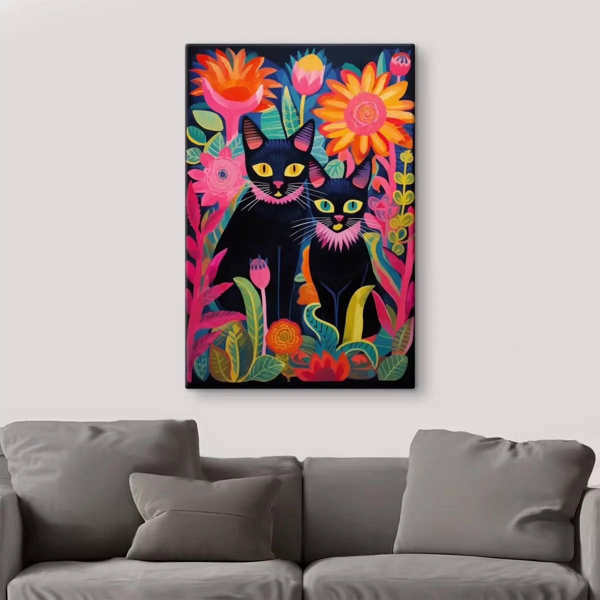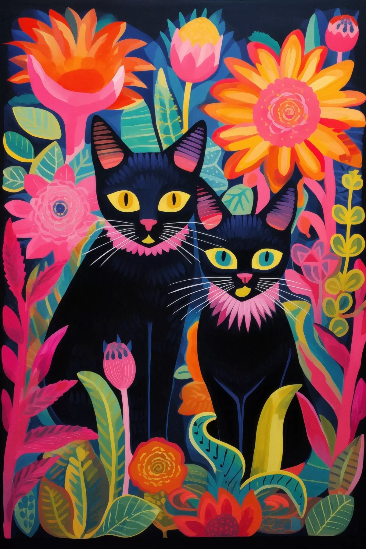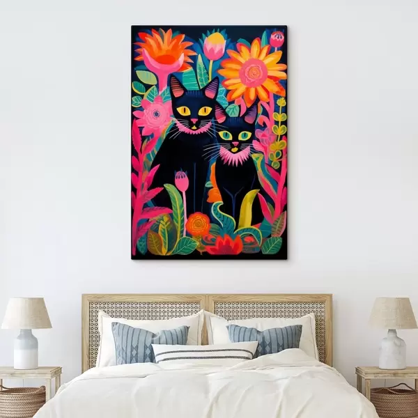 Glezna Divas melnas kaķi starp košām puķēm Nr s47299