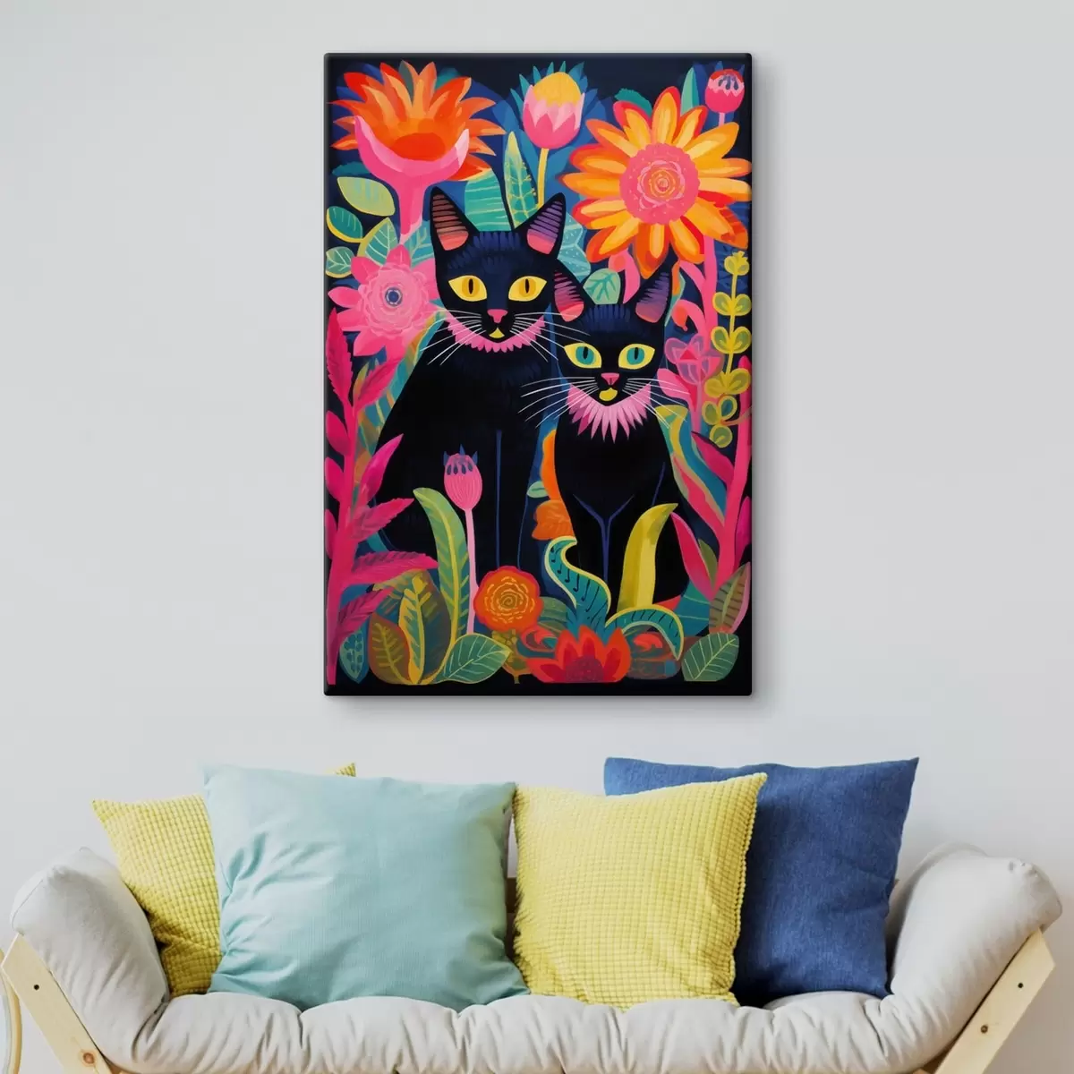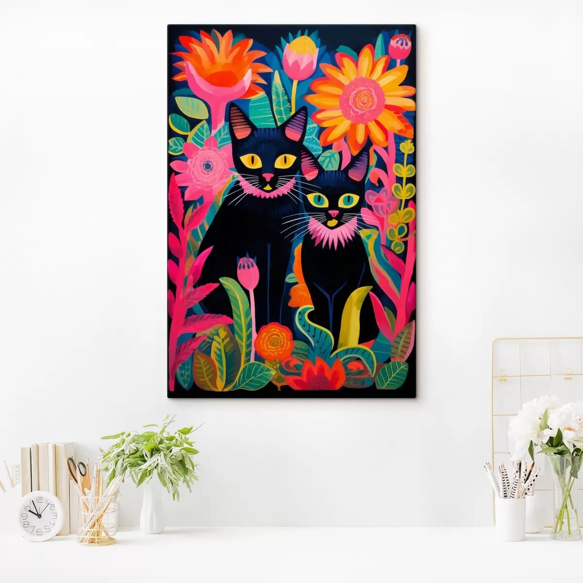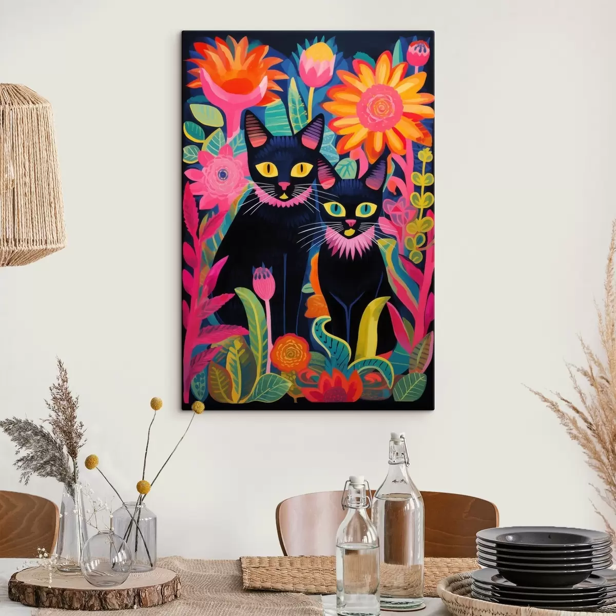 Glezna Divas melnas kaķi starp košām puķēm Nr s47299