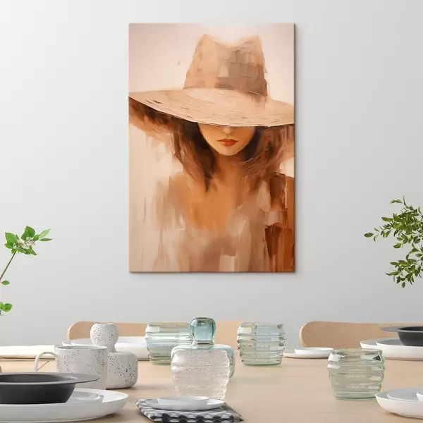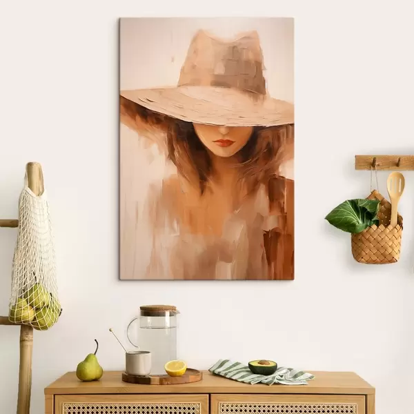 Glezna Sieviete cepurē ar siltām abstraktajām līnijām Nr s47312
