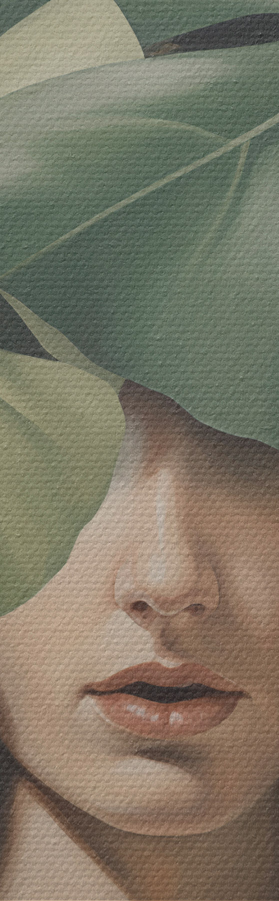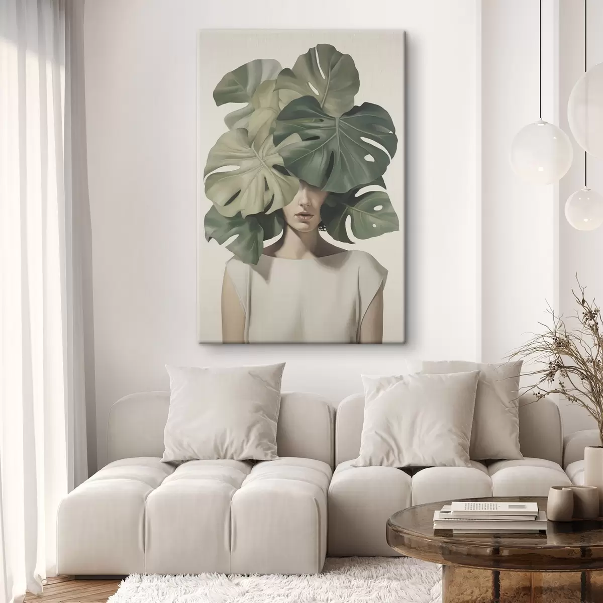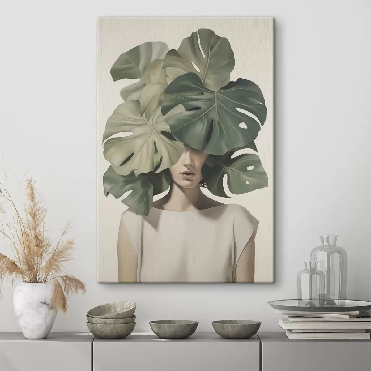 Glezna Abstrakts meitenes portrets ar monstera lapām s47336