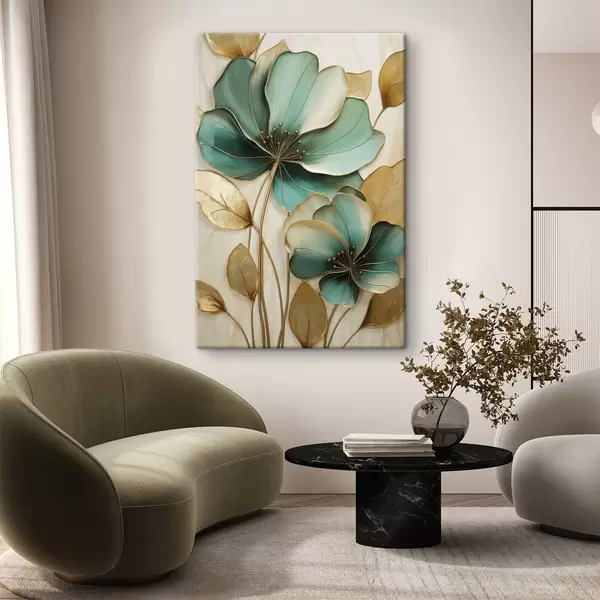 Glezna Lieli zaļgani zili un dzelteni ziedi ar kontūrām, apņemti ar dzeltenām lapām uz abstraktā fona s47418