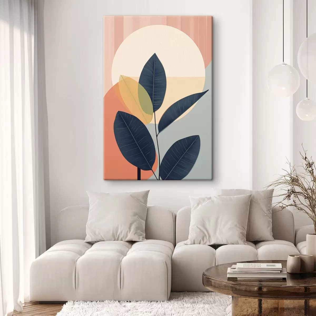 Glezna Tumšas lapas uz abstraktu figūru fona persiku un pelēkā krāsā ar lielu, gaiši dzeltenu apli s47424