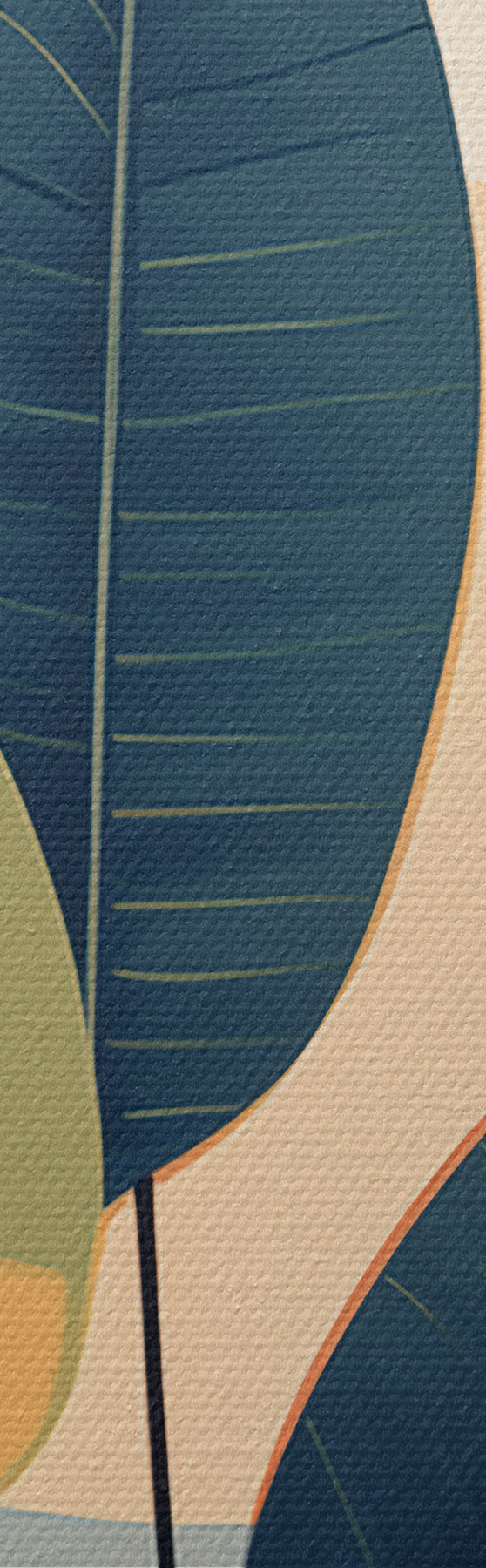 Glezna Tumšas lapas uz abstraktu figūru fona persiku un pelēkā krāsā ar lielu, gaiši dzeltenu apli Nr s47424