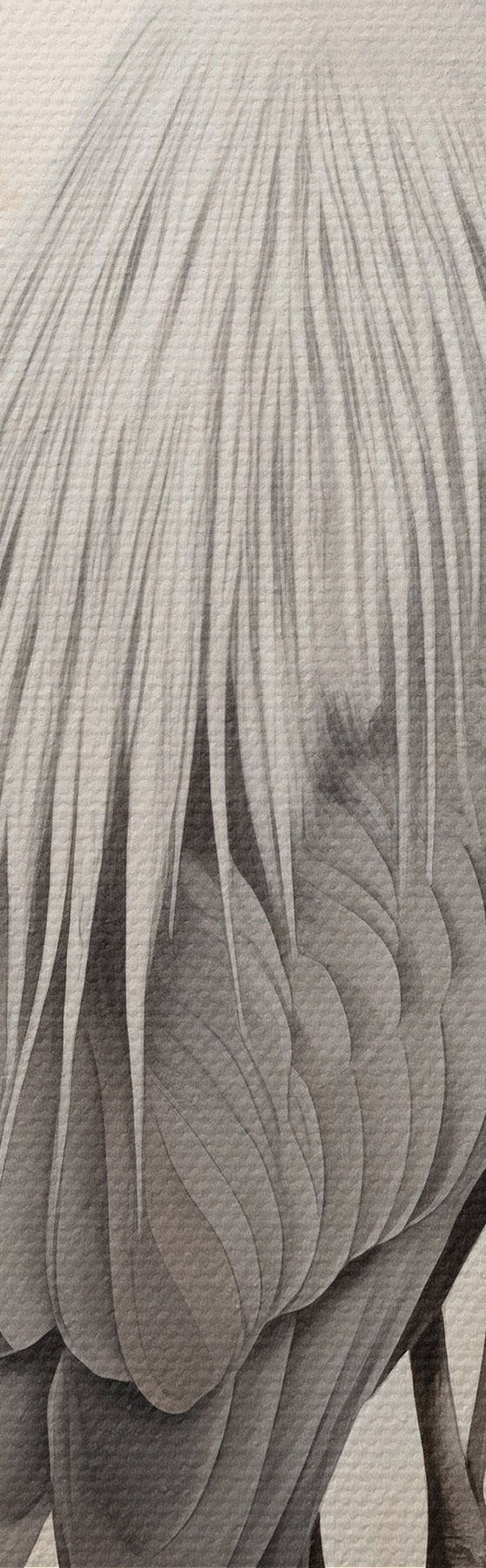 Glezna Gārgale stāv uz akmens ezerā, fonā redzami augsti zāles stiebri un koki. Nr s47426