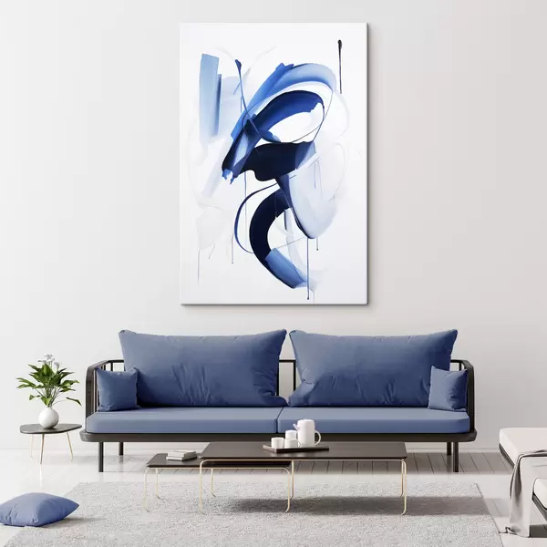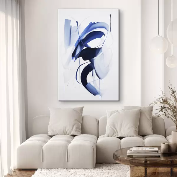 Glezna Abstraktas zilas, otu triepienu līdzīgas formas ar plūstošām līnijām un izliekumiem uz balta fona, modernā māksla s47428