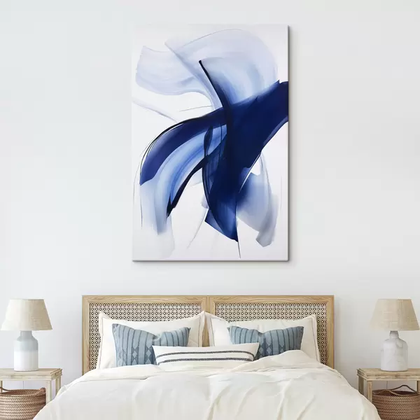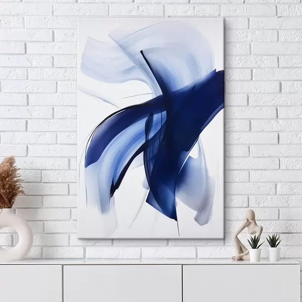 Glezna Abstraktas zilas, otu triepienu līdzīgas formas ar plūstošām līnijām un izliekumiem uz balta fona, modernā māksla Nr s47429