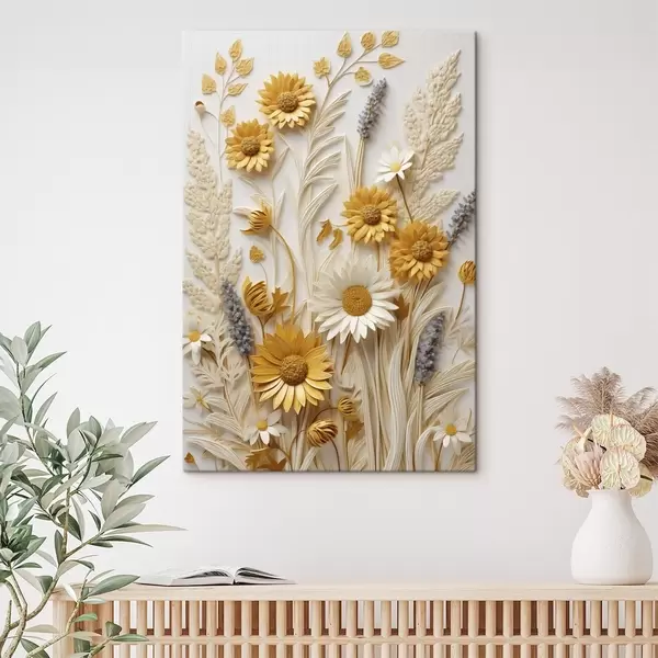 Glezna Teksturēta dzelteno un balto margarīšu kolekcija ar žāvētiem zāles stiebriem un lavandas zariņiem uz balta fona s47430