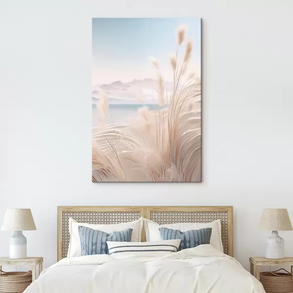 Glezna Augsta, pūkaina pampas zāle maigās smilškrāsas toņos, ar smilšainu pludmali un kalniem fonā Nr s47433