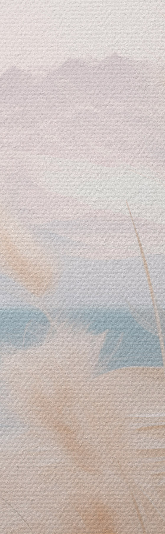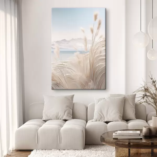 Glezna Augsta, pūkaina pampas zāle maigās smilškrāsas toņos, ar smilšainu pludmali un kalniem fonā s47433