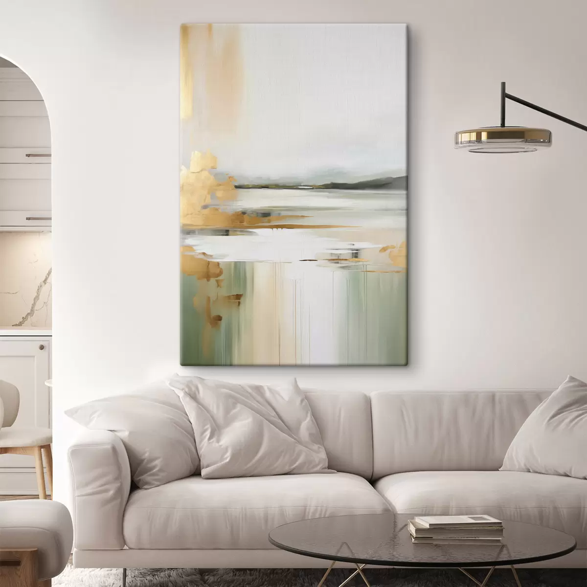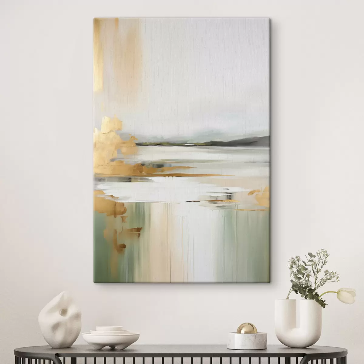 Glezna Abstrakts ainavas ar dzelteniem un zaļiem toņiem, ūdens, kas atspoguļo debesis un tālas kalnus, bāls, miglains debesis s47438