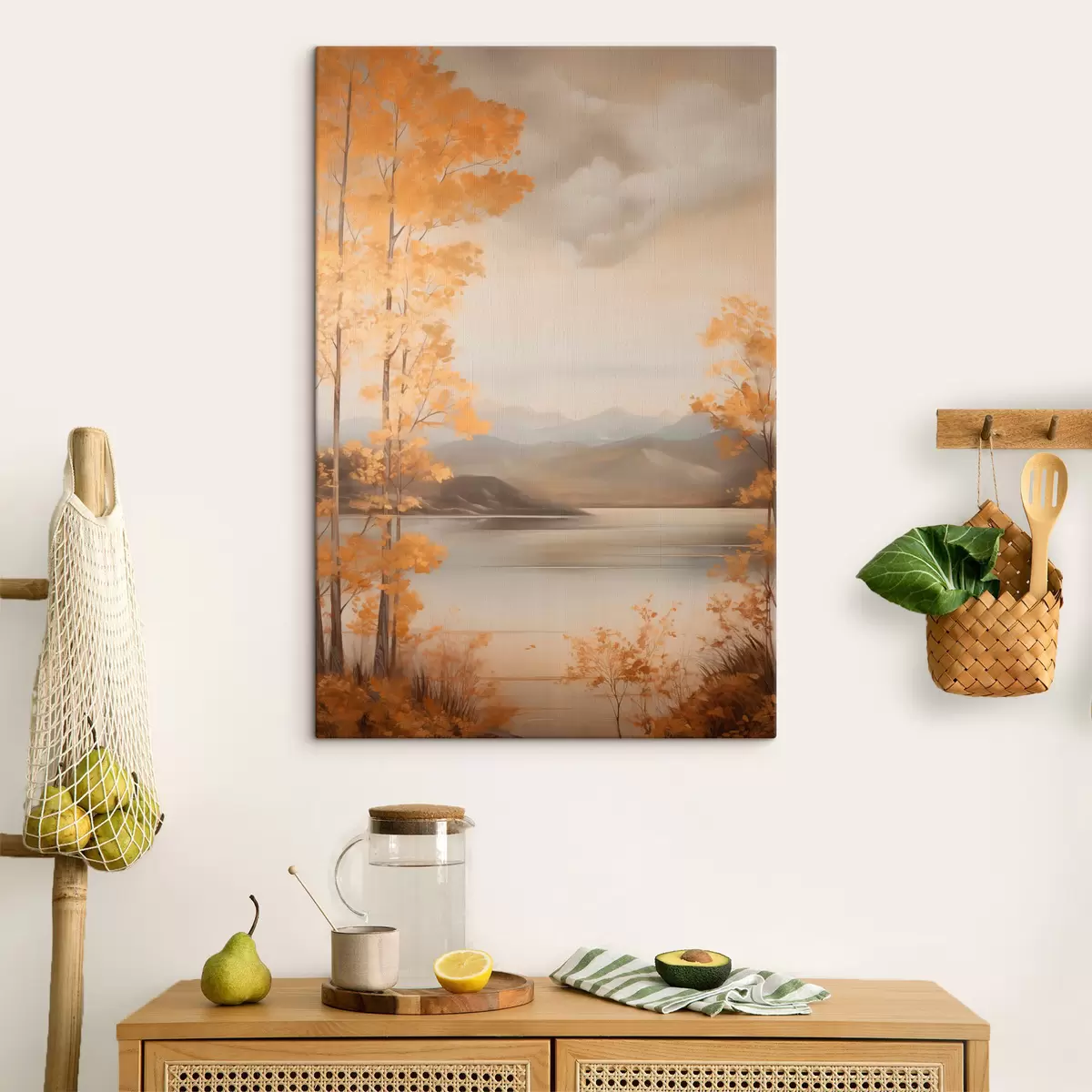 Glezna Rudens teksturēti koki ar oranžām lapām ierāmē mierīgu ezeru ar tālumā redzamām kalnām zem apmākušām debesīm. s47441