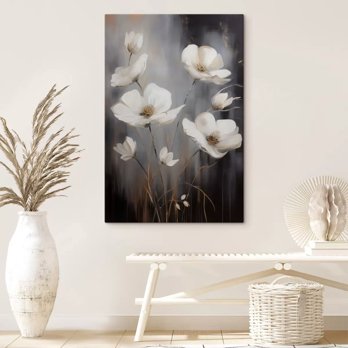 Glezna Baltas ziedi ar brūnu centru un plāniem kātiņiem uz tumša, faktūru fona s47858