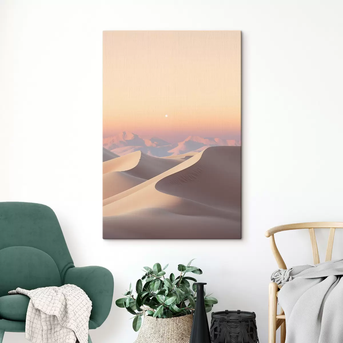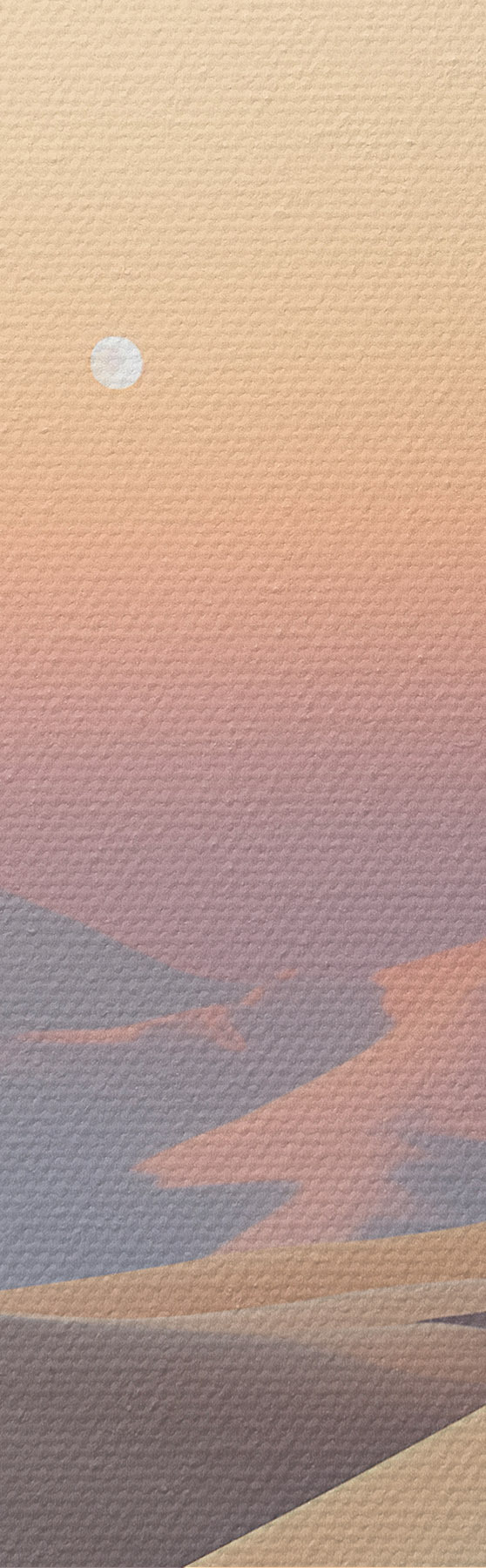 Glezna Tuksneša ainava ar viļņojošām smilšu kāpām zem maiga pasteļtoņa debesīm, fonā redzamas tālas kalnu virsotnes. Nr s47865