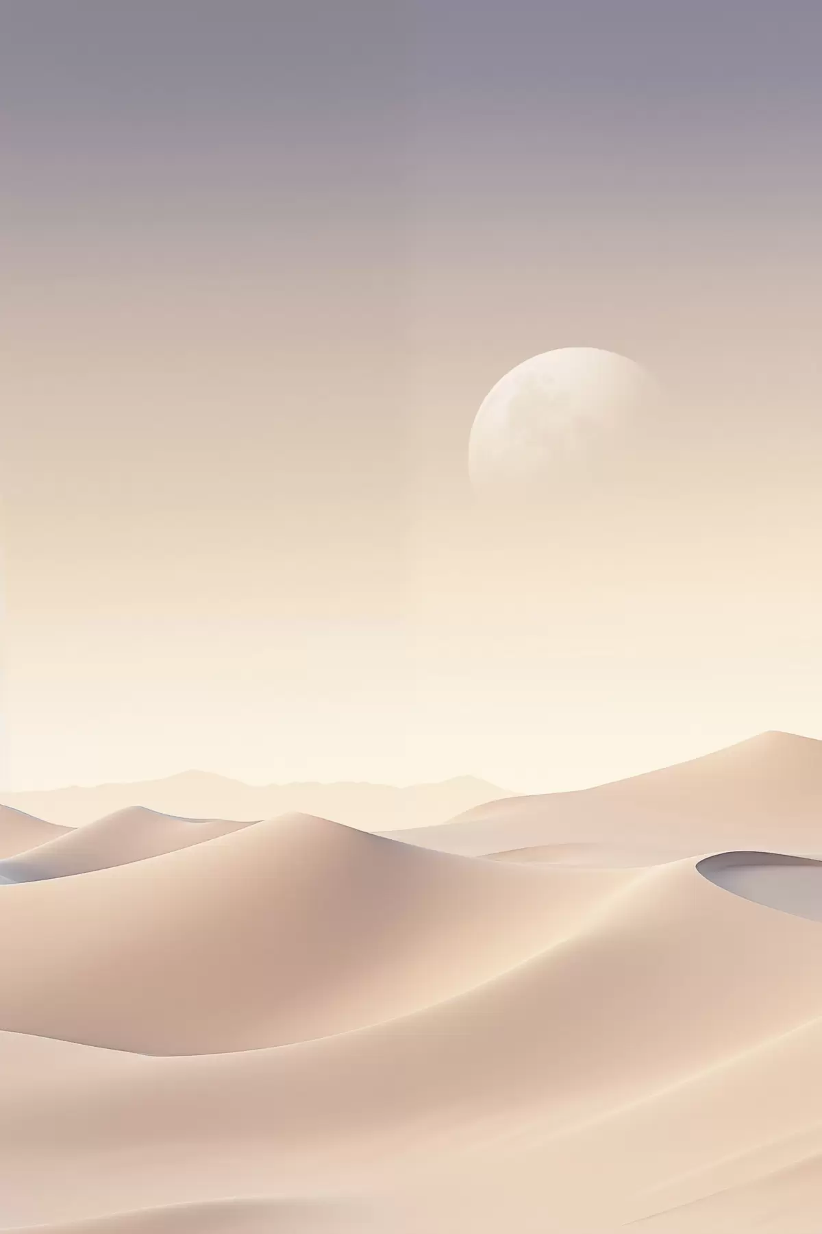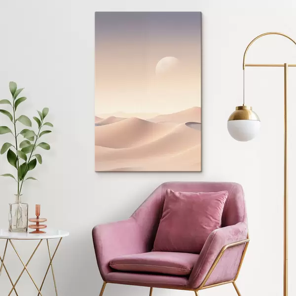 Glezna Tuksneša ainava ar viļņojošām smilšu kāpām zem maiga pasteļtoņa debesīm, fonā redzamas tālas kalnu virsotnes. Nr s47866