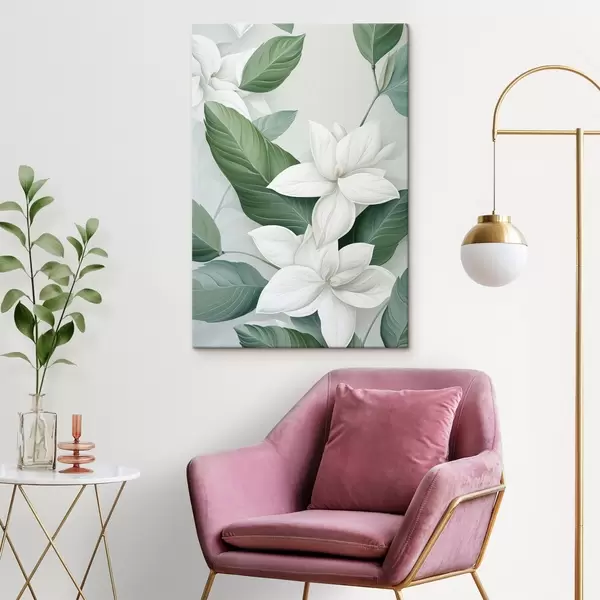 Glezna Baltas puķes ar zaļām lapām, pasteļtoņos fons Nr s47869