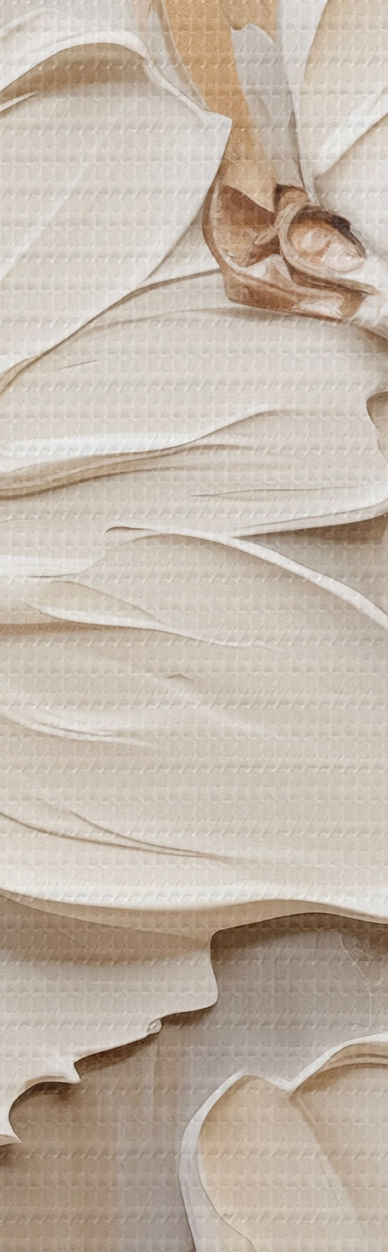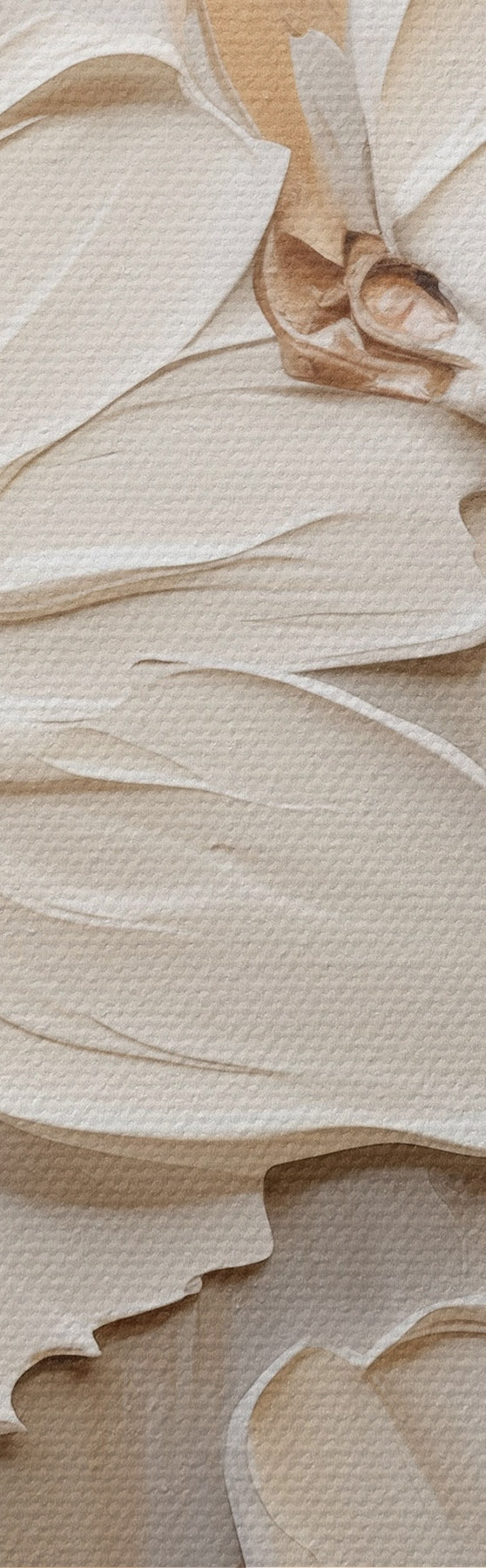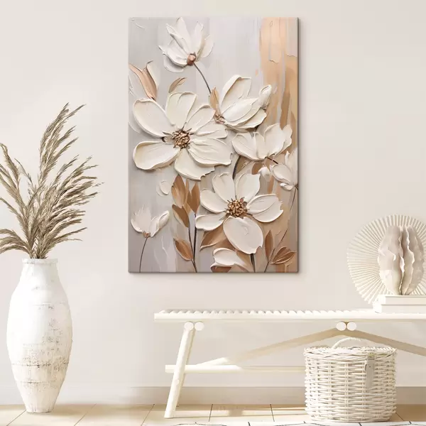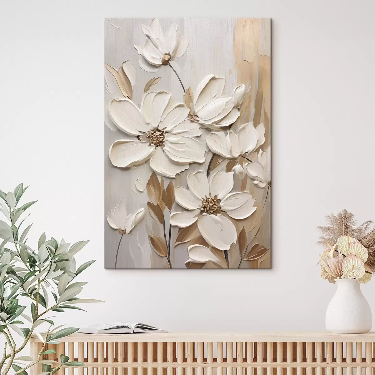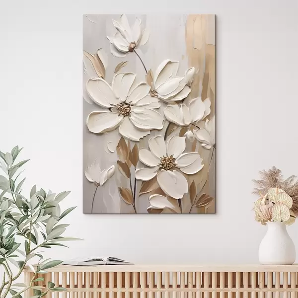 Glezna Abstraktas baltas puķes ar teksturētiem ziedlapiem uz neitrāla fona ar smalkām otu triepienu imitācijām. Nr s47873