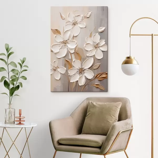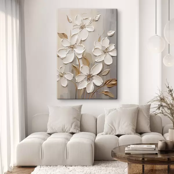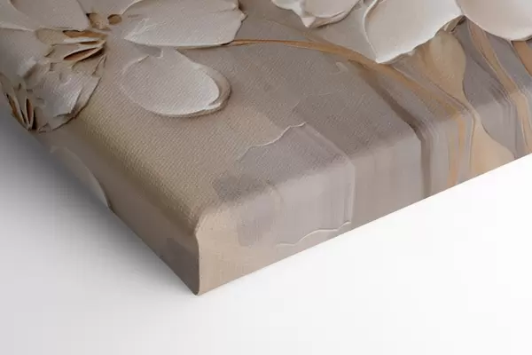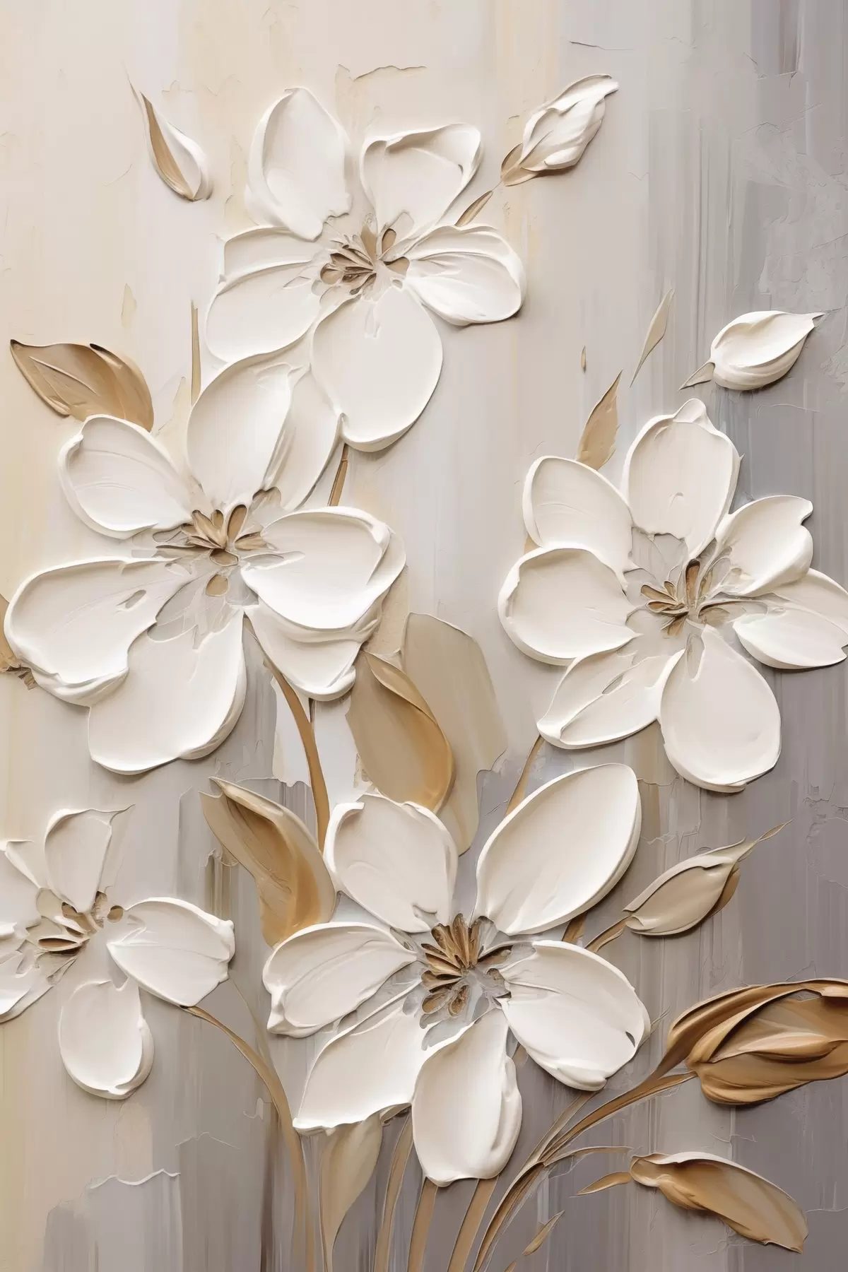 Glezna Abstraktas baltas puķes ar teksturētiem ziedlapiem uz neitrāla fona ar smalkām otu triepienu imitācijām. Nr s47874