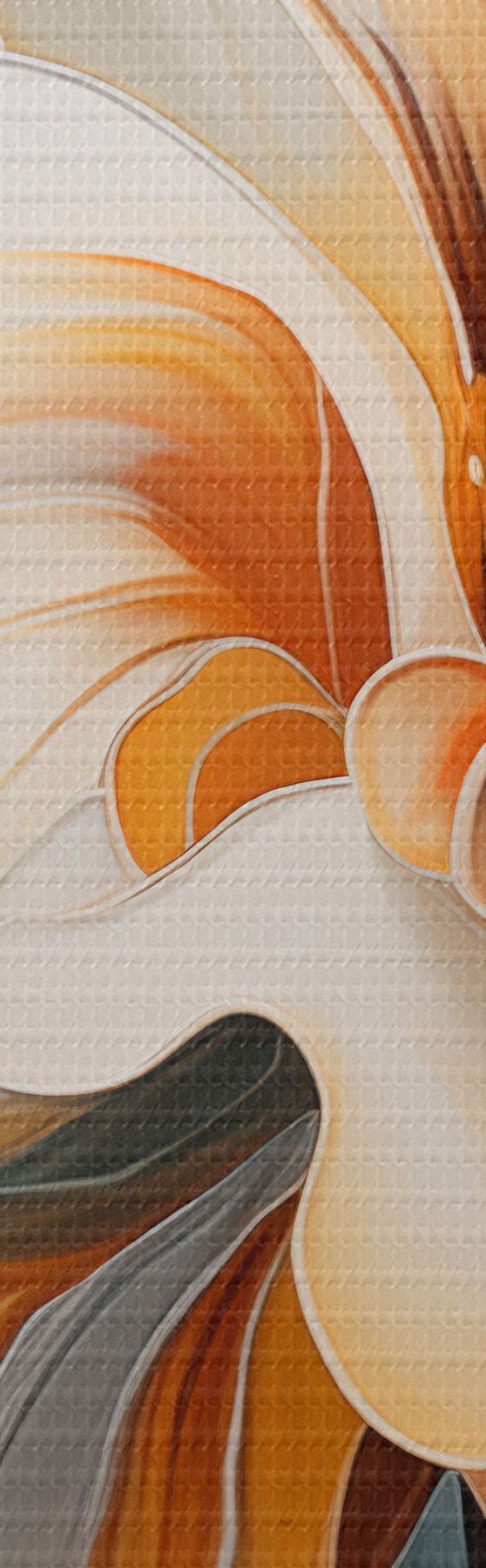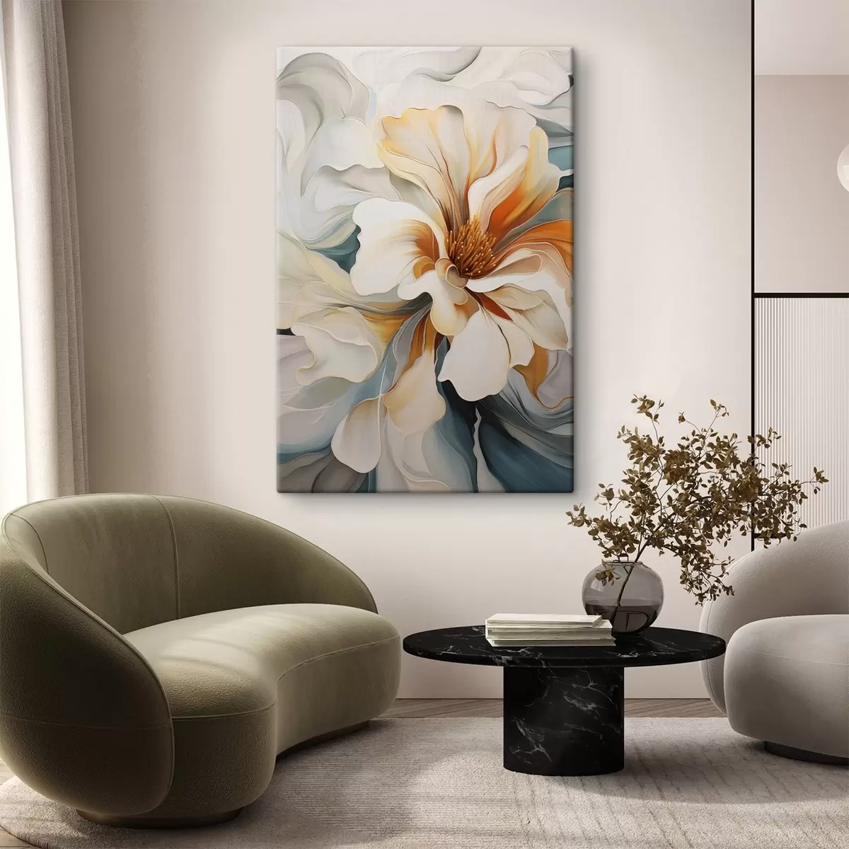 Glezna Abstrakts liels zieds ar baltiem, oranžiem un zaļgani zilganiem ziedlapiem, faktūru fonu s47877