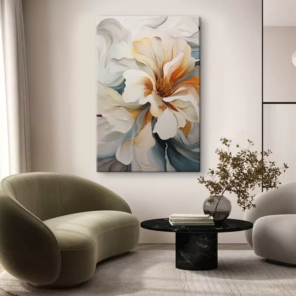 Glezna Abstrakts liels zieds ar baltiem, oranžiem un zaļgani zilganiem ziedlapiem, faktūru fonu Nr s47877
