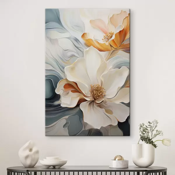 Glezna Abstrakts liels zieds ar baltiem, oranžiem un zaļgani zilganiem ziedlapiem, faktūru fonu s47878