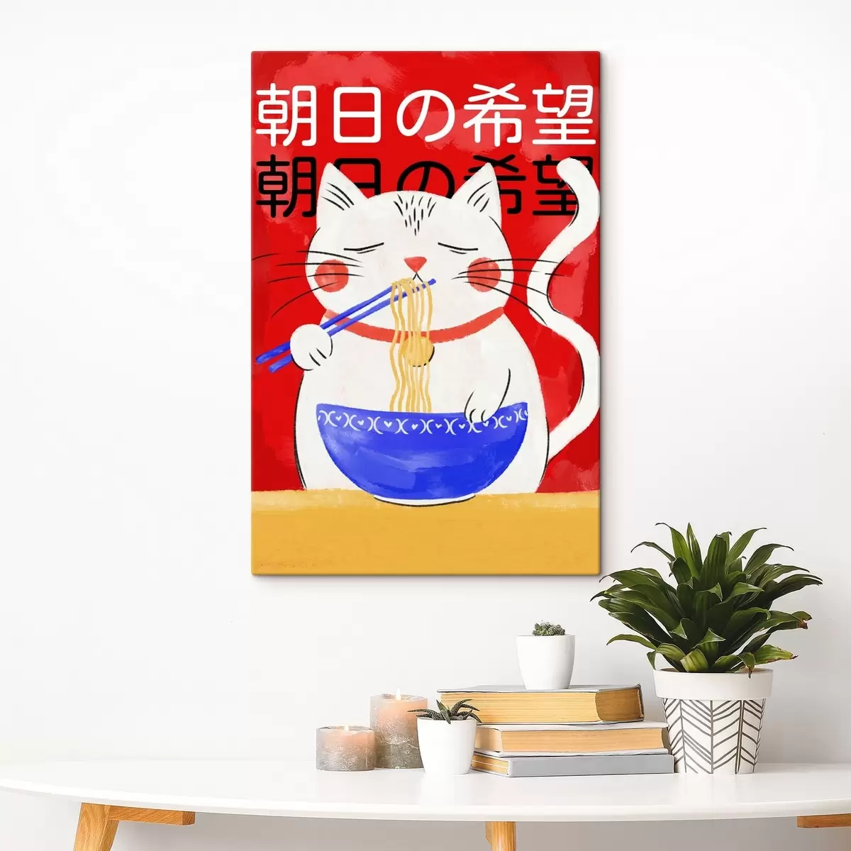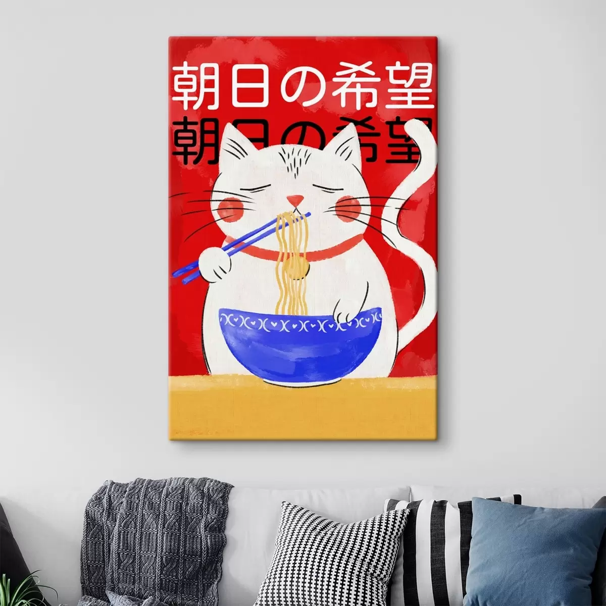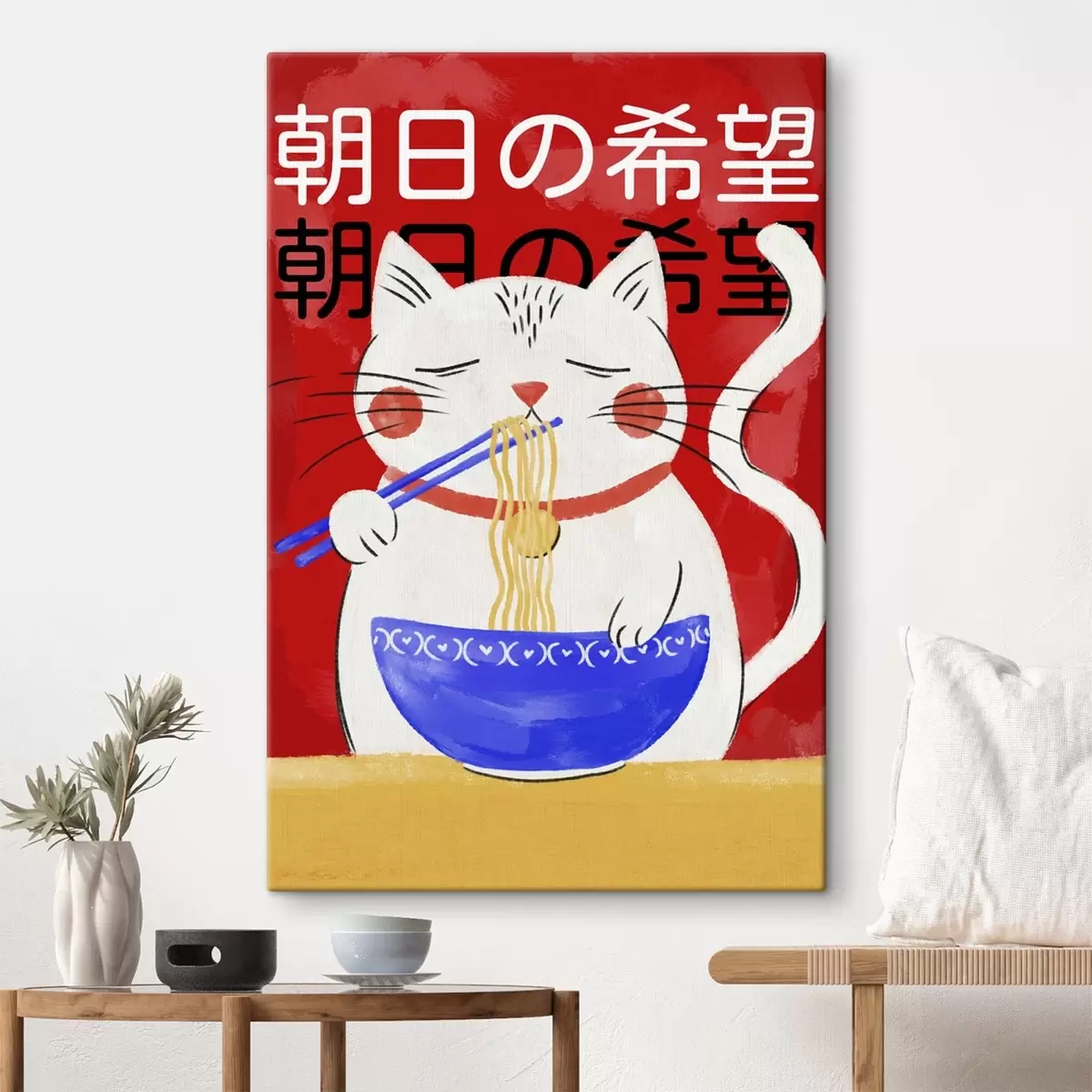 Glezna Ilustrācija, kurā kaķis ēd nūdeles uz sarkana fona s48031