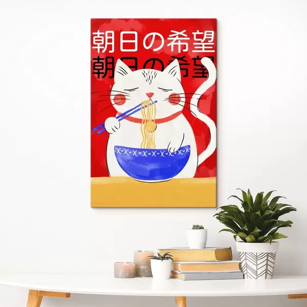 Glezna Ilustrācija, kurā kaķis ēd nūdeles uz sarkana fona Nr s48031